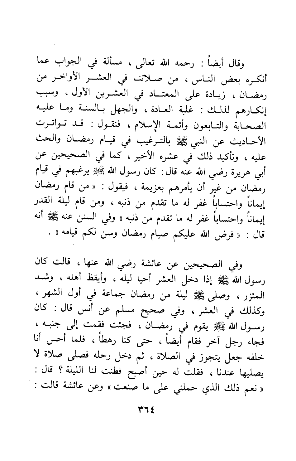 وفي الصحيحين عن عائشة، رضي الله عنها، قالت: " كان رسول الله صلى الله عليه وسلم إذا دخل العشر أحيا ليله، وأيقظ أهله، وشد المئزر " 3، وصلى صلى الله عليه وسلم ليلة من رمضان جماعة في أول الشهر، وكذلك في العشر. وفي صحيح مسلم عن أنس قال: " كان رسول الله صلى الله عليه وسلم يقوم في رمضان، فجئت فقمت إلى جنبه، فجاء رجل آخر فقام أيضاً، حتى كنا رهطاً. فلما أحس أنا خلفه جعل يتجوز في الصلاة. ثم دخل رحله فصلى صلاة لا يصليها عندنا، فقلت له حين أصبح: فطنت لنا الليلة؟ قال: نعم، ذلك الذي حملني على ما صنعت " 4. وعن عائشة قالت: