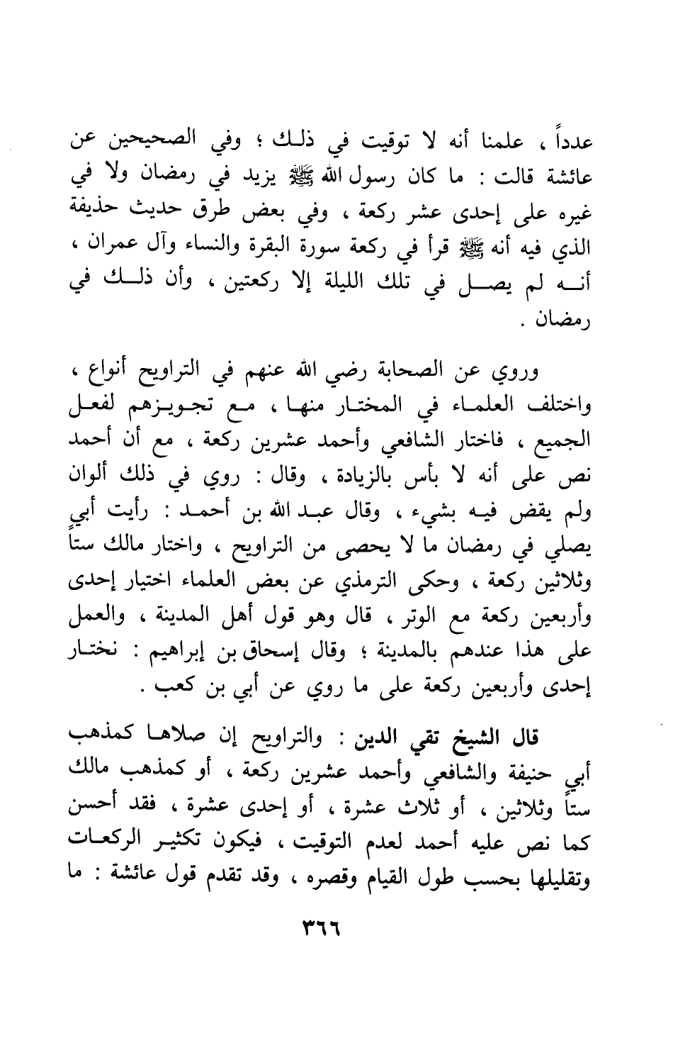 قال الشيخ تقي الدين: والتراويح إن صلاها كمذهب أبي حنيفة والشافعي وأحمد: عشرين ركعة، أو كمذهب مالك: ستاً وثلاثين، أو ثلاث عشرة، أو إحدى عشرة، فقد أحسن كما نص عليه أحمد لعدم التوقيت، فيكون تكثير الركعات وتقليلها بحسب طول القيام وقصره. وقد تقدم قول عائشة: " ما
