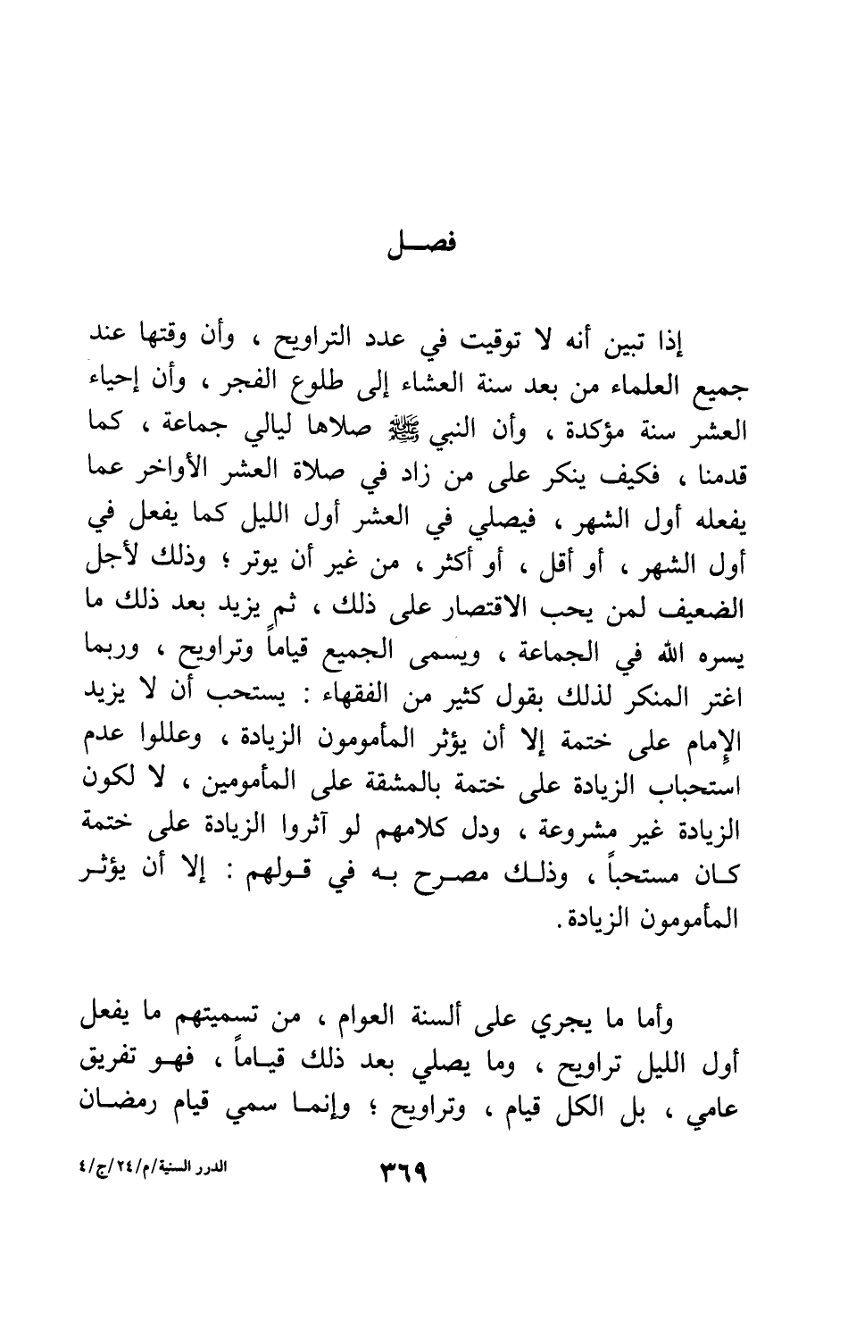 إذا تبين أنه لا توقيت في عدد التراويح، وأن وقتها عند جميع العلماء من بعد سنة العشاء إلى طلوع الفجر، وأن إحياء العشر سنة مؤكدة، وأن النبي صلى الله عليه وسلم صلاها ليالي جماعة، كما قدمنا، فكيف ينكر على من زاد في صلاة العشر الأواخر عما يفعله أول الشهر، فيصلي في العشر أول الليل كما يفعل في أول الشهر، أو أقل، أو أكثر، من غير أن يوتر؟ وذلك لأجل الضعيف لمن يحب الاقتصار على ذلك، ثم يزيد بعد ذلك ما يسره الله في الجماعة، ويسمى الجميع قياماً وتراويح؛ وربما اغتر المنكر لذلك بقول كثير من الفقهاء: يستحب أن لا يزيد الإمام على ختمة إلا أن يؤثر المأمومون الزيادة، وعللوا عدم استحباب الزيادة على ختمة بالمشقة على المأمومين، لا لكون الزيادة غير مشروعة، ودل كلامهم لو آثروا الزيادة على ختمة كان مستحباً، وذلك مصرح به في قولهم: إلا أن يؤثر المأمومون الزيادة.