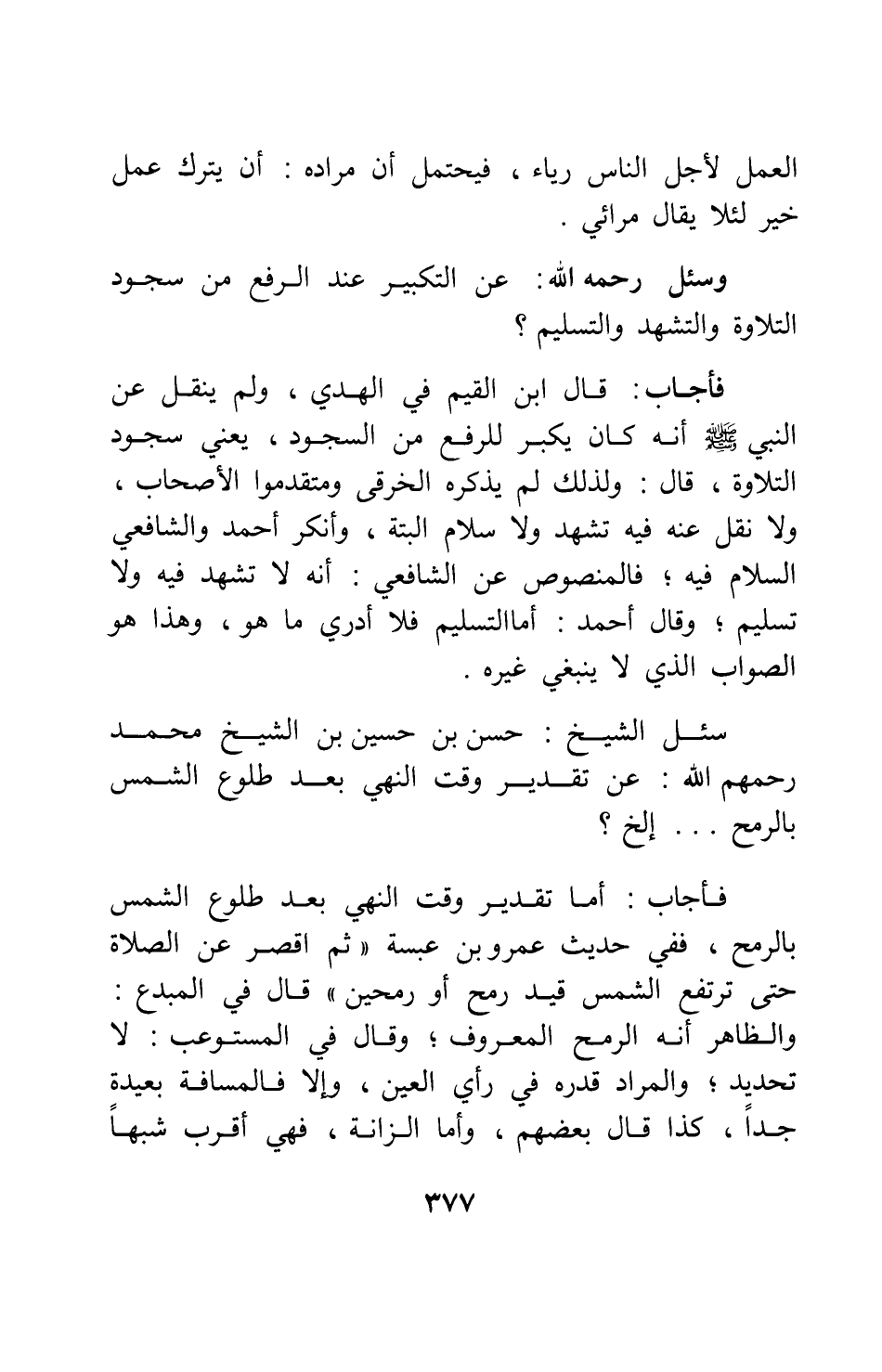 سئل الشيخ حسن بن حسين بن الشيخ محمد، رحمهم الله: عن تقدير وقت النهي بعد طلوع الشمس بالرمح ... إلخ؟