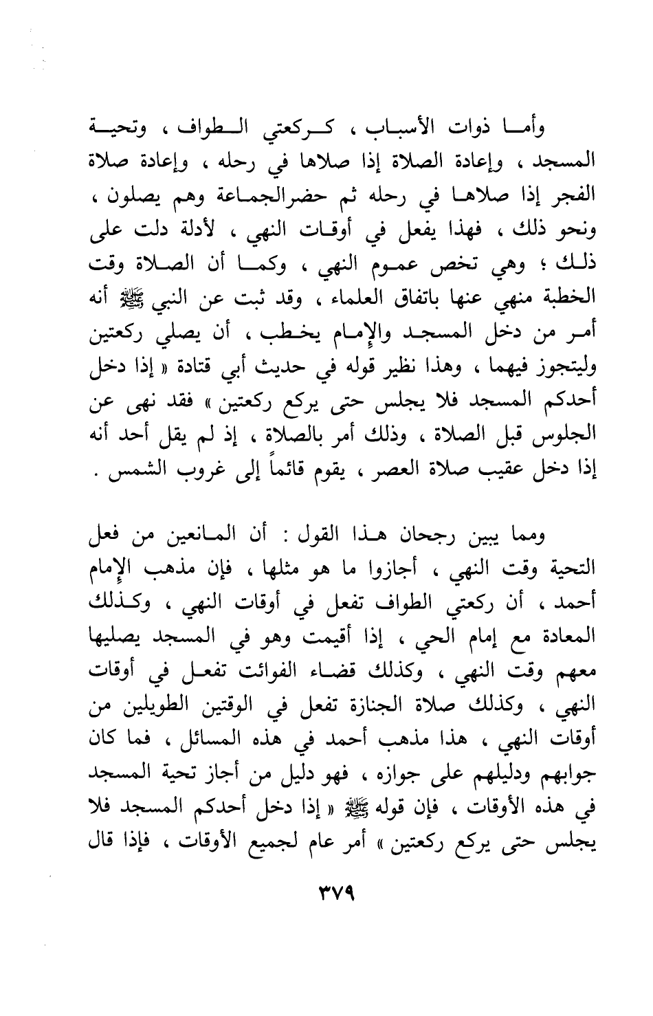 ومما يبين رجحان هذا القول: أن المانعين من فعل التحية وقت النهي، أجازوا ما هو مثلها؛ فإن مذهب الإمام أحمد، أن ركعتي الطواف تفعل في أوقات النهي، وكذلك المعادة مع إمام الحي، إذا أقيمت وهو في المسجد يصليها معهم وقت النهي، وكذلك قضاء الفوائت تفعل في أوقات النهي، وكذلك صلاة الجنازة تفعل في الوقتين الطويلين من أوقات النهي؛ هذا مذهب أحمد في هذه المسائل، فما كان جوابهم ودليلهم على جوازه، فهو دليل من أجاز تحية المسجد في هذه الأوقات، فإن قوله صلى الله عليه وسلم: " إذا دخل أحدكم المسجد، فلا يجلس حتى يركع ركعتين " 2 أمر عام لجميع الأوقات، فإذا قال