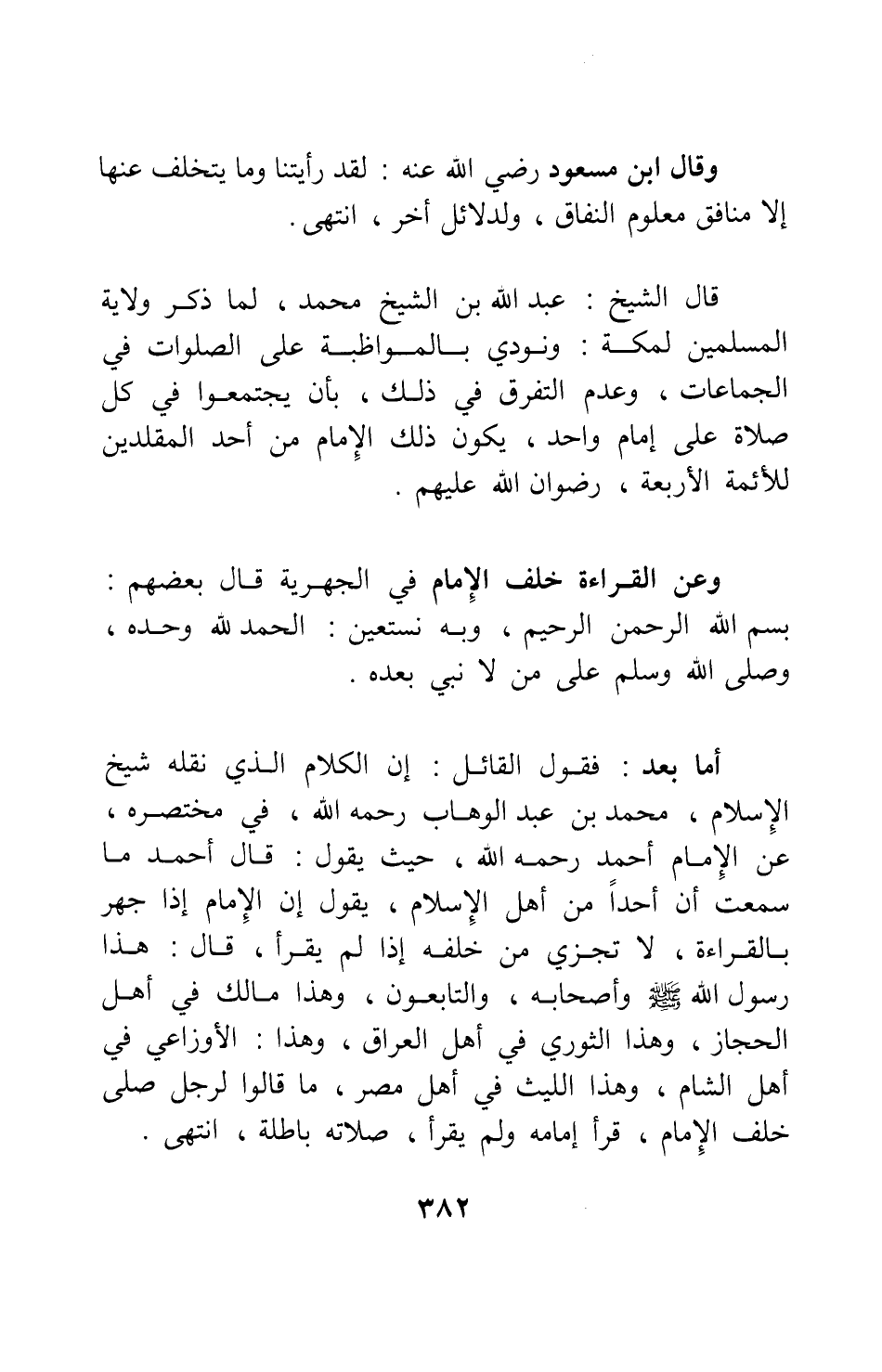 وعن القراءة خلف الإمام في الجهرية قال بعضهم: بسم الله الرحمن الرحيم، وبه نستعين. الحمد لله وحده، وصلى الله وسلم على من لا نبي بعده. أما بعد: فقول القائل: إن الكلام الذي نقله شيخ الإسلام، محمد بن عبد الوهاب، رحمه الله، في مختصره، عن الإمام أحمد، رحمه الله، حيث يقول: قال أحمد: ما سمعت أن أحداً من أهل الإسلام، يقول إن الإمام إذا جهر بالقراءة، لا تجزي من خلفه إذا لم يقرأ، قال: هذا رسول الله صلى الله عليه وسلم وأصحابه، والتابعون، وهذا مالك في أهل الحجاز، وهذا الثوري في أهل العراق، وهذا الأوزاعي في أهل الشام، وهذا الليث في أهل مصر، ما قالوا لرجل صلى خلف الإمام، قرأ إمامه ولم يقرأ: صلاته باطلة. انتهى.