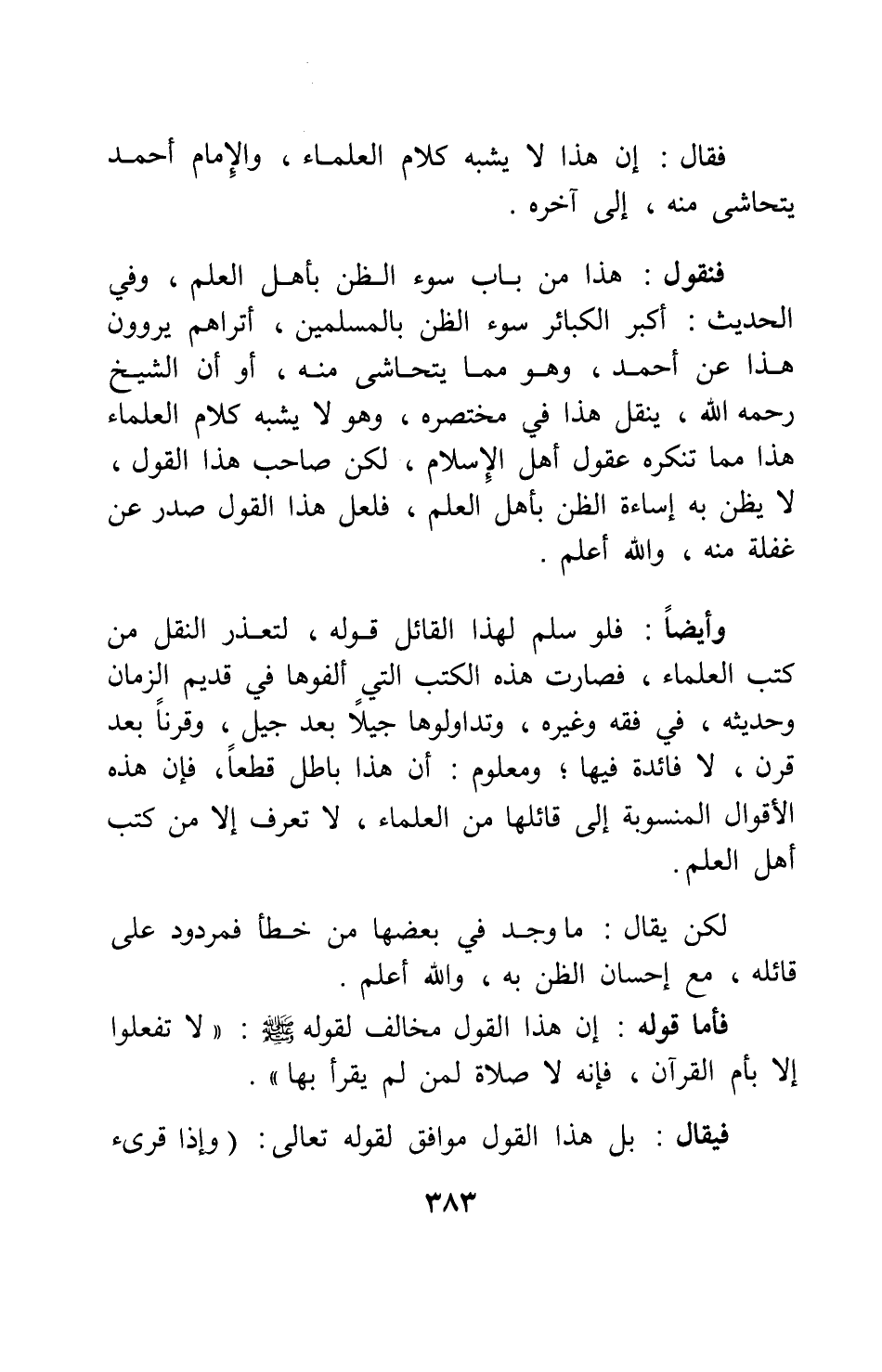 فقال: إن هذا لا يشبه كلام العلماء، والإمام أحمد يتحاشى منه ... إلخ.
