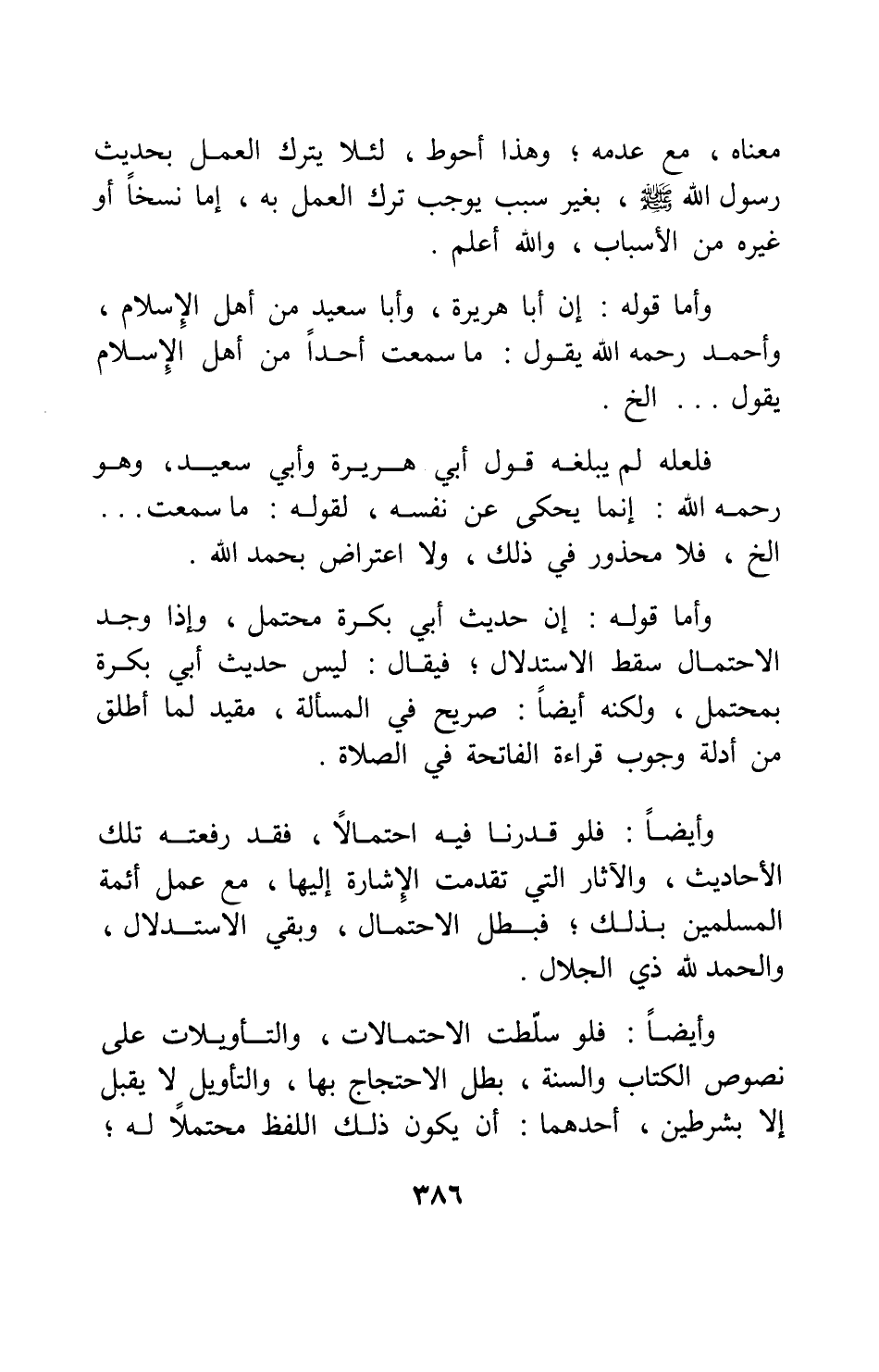 وأيضاً: فلو سلطت الاحتمالات والتأويلات على نصوص الكتاب والسنة، بطل الاحتجاج بها؛ والتأويل لا يقبل إلا بشرطين، أحدهما: أن يكون ذلك اللفظ محتملاً له.