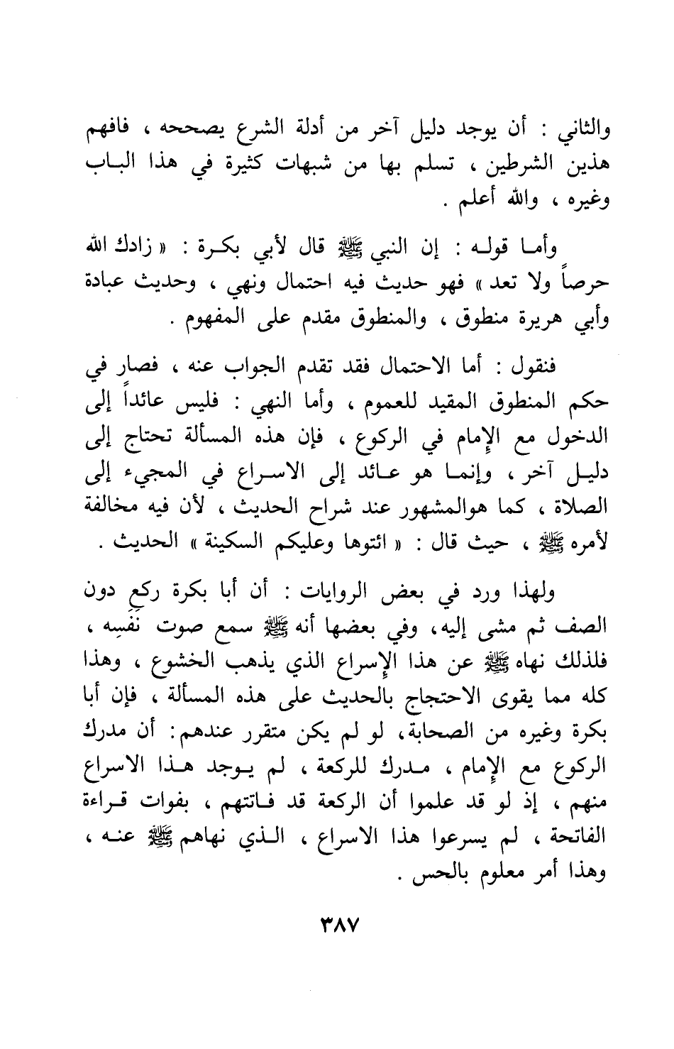 فنقول: أما الاحتمال فقد تقدم الجواب عنه، فصار في حكم المنطوق المقيد للعموم، وأما النهي: فليس عائداً إلى الدخول مع الإمام في الركوع، فإن هذه المسألة تحتاج إلى دليل آخر، وإنما هو عائد إلى الإسراع في المجيء إلى الصلاة، كما هو المشهور عند شراح الحديث، لأن فيه مخالفة لأمره صلى الله عليه وسلم حيث قال: " ائتوها وعليكم السكينة " 2 الحديث.