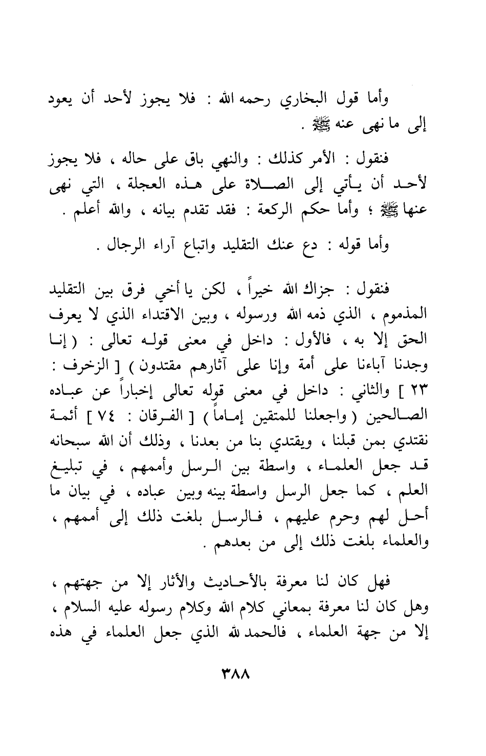 فنقول: جزاك الله خيراً، لكن يا أخي فرق بين التقليد المذموم، الذي ذمه الله ورسوله، وبين الاقتداء الذي لا يعرف الحق إلا به؛ فالأول: داخل في معنى قوله تعالى: {إِنَّا وَجَدْنَا آبَاءَنَا عَلَى أُمَّةٍ وَإِنَّا عَلَى آثَارِهِمْ مُقْتَدُونَ} [سورة الزخرف آية: 23] ، والثاني: داخل في معنى قوله تعالى إخباراً عن عباده الصالحين: {وَاجْعَلْنَا لِلْمُتَّقِينَ إِمَاماً} [سورة الفرقان آية: 74] ، أئمة نقتدي بمن قبلنا، ويقتدي بنا من بعدنا؛ وذلك أن الله سبحانه قد جعل العلماء واسطة بين الرسل وأممهم في تبليغ العلم، كما جعل الرسل واسطة بينه وبين عباده، في بيان ما أحل لهم وحرم عليهم، فالرسل بلغت ذلك إلى أممهم، والعلماء بلغت ذلك إلى من بعدهم.