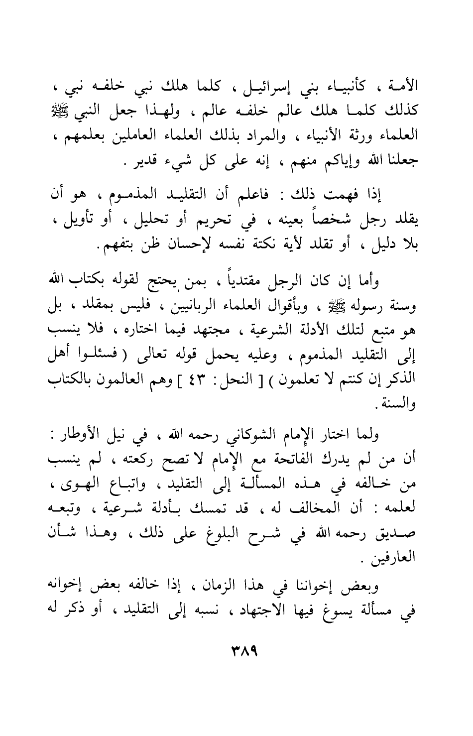 وأما إن كان الرجل مقتدياً بمن يحتج لقوله بكتاب الله وسنة رسوله صلى الله عليه وسلم وبأقوال العلماء الربانيين، فليس بمقلد، بل هو متبع لتلك الأدلة الشرعية، مجتهد فيما اختاره، فلا ينسب إلى التقليد المذموم؛ وعليه يحمل قوله تعالى {فَاسْأَلوا أَهْلَ الذِّكْرِ إِنْ كُنْتُمْ لا تَعْلَمُونَ} [سورة النحل آية: 43] ، وهم العالمون بالكتاب والسنة.