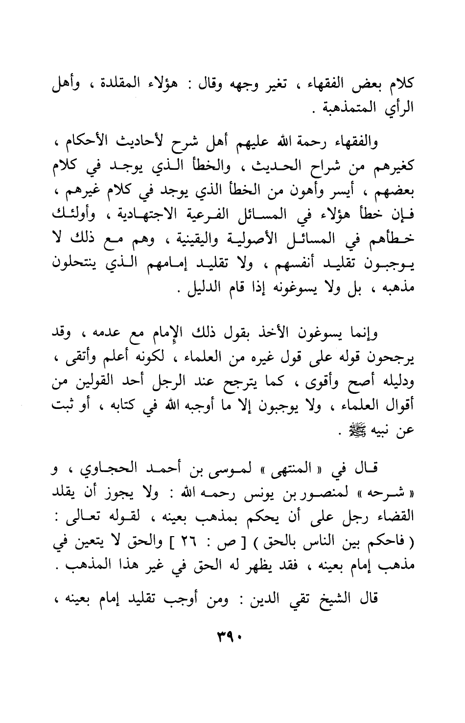 والفقهاء، رحمة الله عليهم، أهل شرح لأحاديث الأحكام، كغيرهم من شراح الحديث، والخطأ الذي يوجد في كلام بعضهم أيسر وأهون من الخطإ الذي يوجد في كلام غيرهم؛ فإن خطأ هؤلاء في المسائل الفرعية الاجتهادية، وأولئك خطؤهم في المسائل الأصولية واليقينية، وهم مع ذلك لا يوجبون تقليد أنفسهم، ولا تقليد إمامهم الذي ينتحلون مذهبه، بل ولا يسوغونه إذا قام الدليل؛ وإنما يسوغون الأخذ بقول ذلك الإمام مع عدمه، وقد يرجحون قوله على قول غيره من العلماء، لكونه أعلم وأتقى، ودليله أصح وأقوى، كما يترجح عند الرجل أحد القولين من أقوال العلماء، ولا يوجبون إلا ما أوجبه الله في كتابه، أو ثبت عن نبيه صلى الله عليه وسلم.