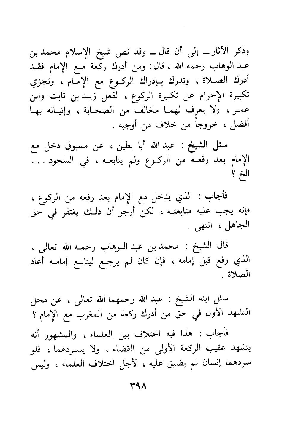وذكر الآثار - إلى أن قال - وقد نص شيخ الإسلام محمد بن عبد الوهاب، رحمه الله، قال: ومن أدرك ركعة مع الإمام فقد أدرك الصلاة؛ وتدرك بإدراك الركوع مع الإمام، وتجزي تكبيرة الإحرام عن تكبيرة الركوع، لفعل زيد بن ثابت وابن عمر، ولا يعرف لهما مخالف من الصحابة، وإتيانه بها أفضل، خروجاً من خلاف من أوجبه.