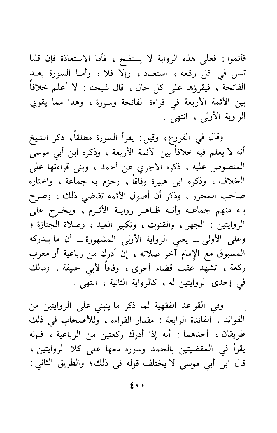وفي القواعد الفقهية، لما ذكر ما ينبني على الروايتين من الفوائد: الفائدة الرابعة: مقدار القراءة، وللأصحاب في ذلك طريقان: أحدهما: أنه إذا أدرك ركعتين من الرباعية، فإنه يقرأ في المقضيتين بالحمد وسورة معها على كلا الروايتين؛ قال ابن أبي موسى: لا يختلف قوله في ذلك. والطريق الثاني: