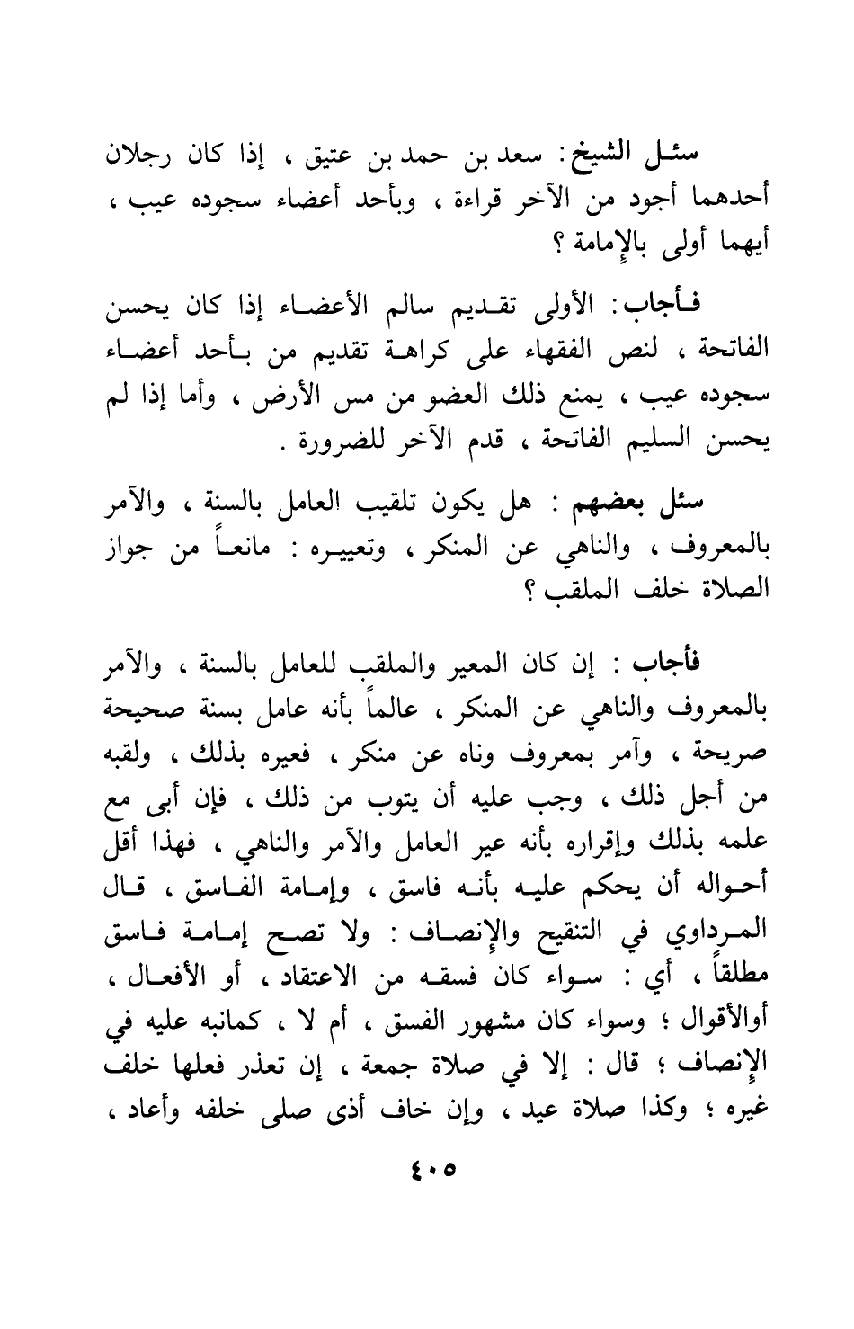 فأجاب: إن كان المعير والملقب للعامل بالسنة، والآمر بالمعروف والناهي عن المنكر، عالماً بأنه عامل بسنة صحيحة صريحة، وآمر بمعروف وناه عن منكر، فعيره بذلك، ولقبه من أجل ذلك، وجب عليه أن يتوب من ذلك؛ فإن أبى مع علمه بذلك وإقراره بأنه عير العامل والآمر والناهي، فهذا أقل أحواله أن يحكم عليه بأنه فاسق، وإمامة الفاسق، قال المرداوي في التنقيح والإنصاف: ولا تصح إمامة فاسق مطلقاً، أي: سواء كان فسقه من الاعتقاد، أو الأفعال، أو الأقوال، وسواء كان مشهور الفسق، أم لا، كما نبه عليه في الإنصاف; قال: إلا في صلاة جمعة، إن تعذر فعلها خلف غيره، وكذا صلاة عيد؛ وإن خاف أذى صلى خلفه وأعاد،