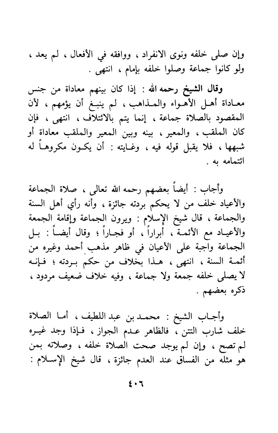 وأجاب أيضاً بعضهم، رحمه الله تعالى: صلاة الجماعة والأعياد خلف من لا يحكم بردته جائزة، وأنه رأي أهل السنة والجماعة؛ قال شيخ الإسلام: ويرون الجماعة وإقامة الجمعة والأعياد مع الأئمة، أبراراً أو فجاراً; وقال أيضاً: بل الجماعة واجبة على الأعيان في ظاهر مذهب أحمد وغيره من أئمة السنة. انتهى. هذا بخلاف من حكم بردته، فإنه لا يصلى خلفه جمعة ولا جماعة؛ وفيه خلاف ضعيف مردود، ذكره بعضهم.