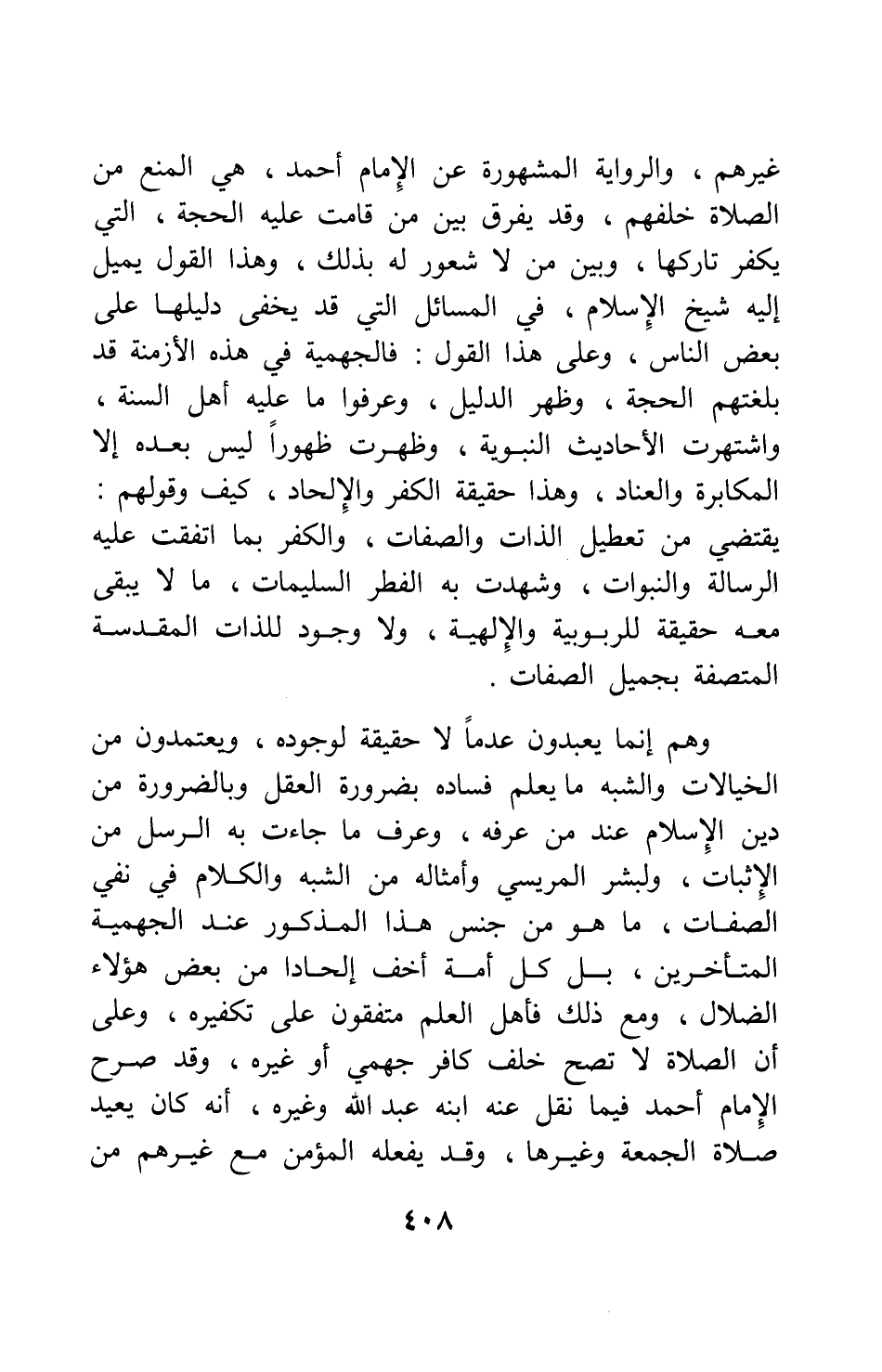 غيرهم؛ والرواية المشهورة عن الإمام أحمد، هي المنع من الصلاة خلفهم، وقد يفرق بين من قامت عليه الحجة التي يكفر تاركها، وبين من لا شعور له بذلك؛ وهذا القول يميل إليه شيخ الإسلام، في المسائل التي قد يخفى دليلها على بعض الناس. وعلى هذا القول: فالجهمية في هذه الأزمنة قد بلغتهم الحجة، وظهر الدليل، وعرفوا ما عليه أهل السنة، واشتهرت الأحاديث النبوية وظهرت ظهوراً ليس بعده إلا المكابرة والعناد، وهذا حقيقة الكفر والإلحاد، كيف وقولهم: يقتضي من تعطيل الذات والصفات، والكفر بما اتفقت عليه الرسالة والنبوات، وشهدت به الفطر السليمات، ما لا يبقى معه حقيقة للربوبية والإلهية، ولا وجود للذات المقدسة المتصفة بجميل الصفات.
