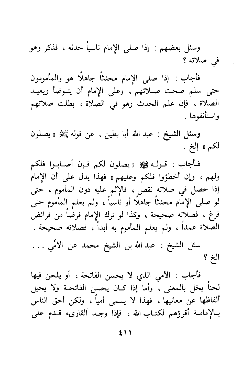 فأجاب: قوله صلى الله عليه وسلم: " يصلون لكم، فإن أصابوا فلكم ولهم، وإن أخطؤوا فلكم وعليهم " 1، فهذا يدل على أن الإمام إذا حصل في صلاته نقص، فالإثم عليه دون المأموم، حتى لو صلى الإمام محدثاً جاهلاً أو ناسياً، ولم يعلم المأموم حتى فرغ، فصلاته صحيحة؛ وكذا لو ترك الإمام فرضاً من فرائض الصلاة عمداً، ولم يعلم المأموم به أبداً، فصلاته صحيحة.