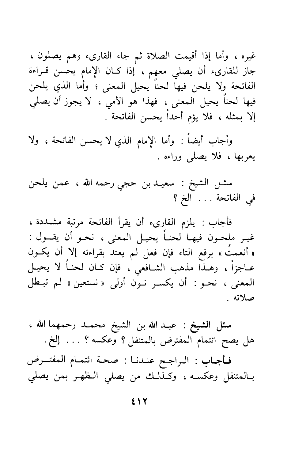 وأجاب أيضاً: وأما الإمام الذي لا يحسن الفاتحة، ولا يعربها، فلا يصلى وراءه.