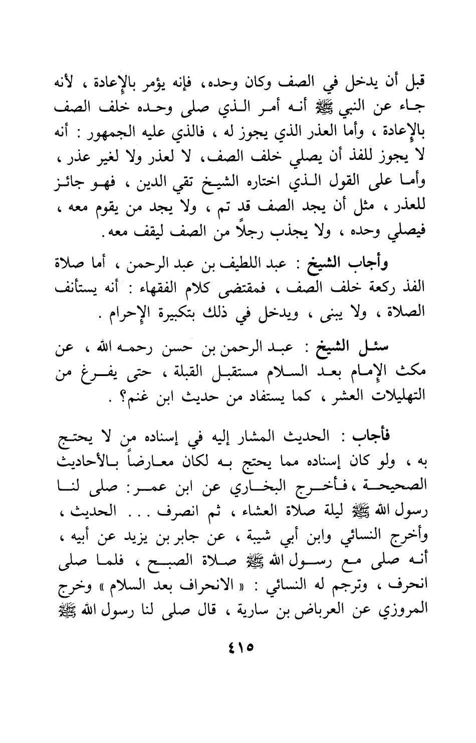 وأجاب الشيخ عبد اللطيف بن عبد الرحمن: أما صلاة الفذ ركعة خلف الصف، فمقتضى كلام الفقهاء: أنه يستأنف الصلاة، ولا يبني، ويدخل في ذلك بتكبيرة الإحرام.