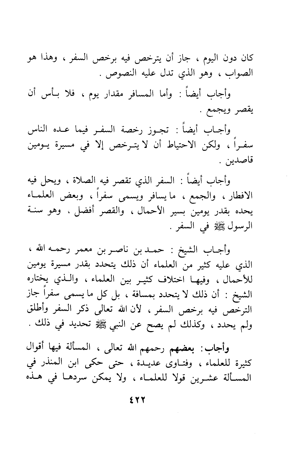 وأجاب الشيخ: حمد بن ناصر بن معمر، رحمه الله: الذي عليه كثير من العلماء أن ذلك يتحدد بقدر مسيرة يومين للأحمال، وفيها اختلاف كثير بين العلماء؛ والذي يختاره الشيخ: أن ذلك لا يتحدد بمسافة، بل كل ما يسمى سفراً جاز الترخص فيه برخص السفر، لأن الله تعالى ذكر السفر وأطلق ولم يحدد، وكذلك لم يصح عن النبي صلى الله عليه وسلم تحديد في ذلك.