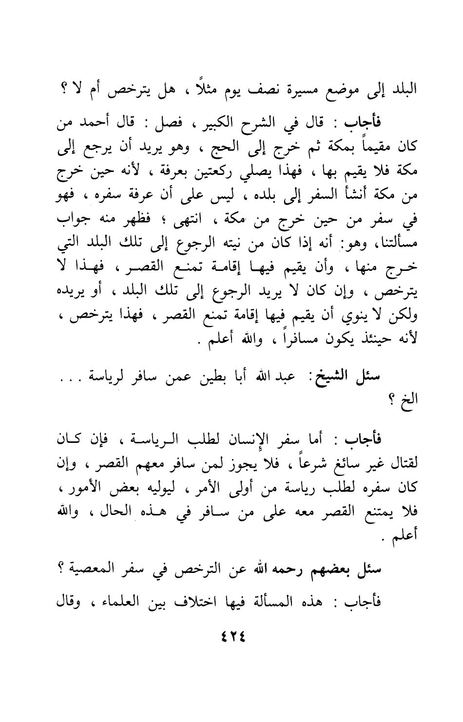 فأجاب: قال في الشرح الكبير: فصل: قال أحمد من كان مقيماً بمكة ثم خرج إلى الحج، وهو يريد أن يرجع إلى مكة فلا يقيم بها، فهذا يصلي ركعتين بعرفة، لأنه حين خرج من مكة أنشأ السفر إلى بلده، ليس على أن عرفة سفره، فهو في سفر من حين خرج من مكة. انتهى. فظهر منه جواب مسألتنا، وهو: أنه إذا كان من نيته الرجوع إلى تلك البلد التي خرج منها، وأن يقيم فيها إقامة تمنع القصر، فهذا لا يترخص، وإن كان لا يريد الرجوع إلى تلك البلد، أو يريده ولكن لا ينوي أن يقيم فيها إقامة تمنع القصر، فهذا يترخص، لأنه حينئذ يكون مسافراً، والله أعلم.