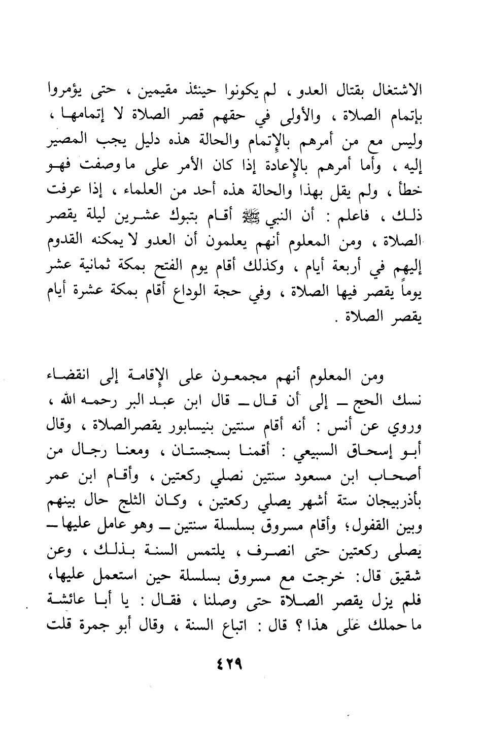 ومن المعلوم أنهم مجمعون على الإقامة إلى انقضاء نسك الحج - إلى أن قال - قال ابن عبد البر، رحمه الله: وروي عن أنس: "أنه أقام سنتين بنيسابور يقصر الصلاة "، وقال أبو إسحاق السبيعي: "أقمنا بسجستان، ومعنا رجال من أصحاب ابن مسعود سنتين نصلي ركعتين "، "وأقام ابن عمر بأذربيجان ستة أشهر يصلي ركعتين، وكان الثلج حال بينهم وبين القفول "، "وأقام مسروق بسلسلة سنتين - وهو عامل عليها - يصلي ركعتين حتى انصرف "، يلتمس السنة بذلك. وعن شقيق قال: "خرجت مع مسروق بسلسلة حين استعمل عليها، فلم يزل يقصر الصلاة حتى وصلن.، فقال: يا أبا عائشة، ما حملك على هذا؟ قال: اتباع السنة "، وقال أبو جمرة: "قلت