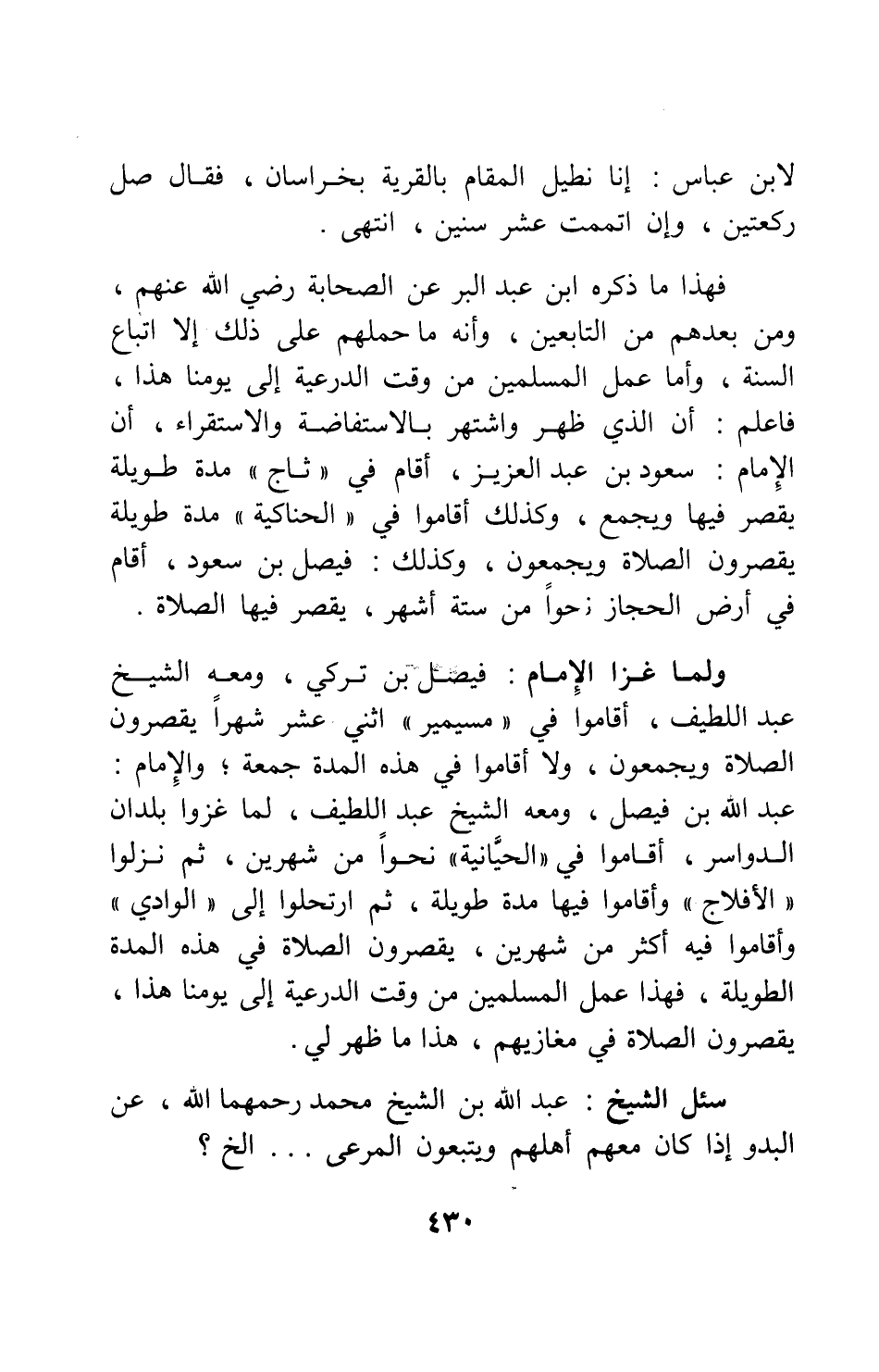 ولما غزا الإمام فيصل بن تركي، ومعه الشيخ عبد اللطيف، أقاموا في مسيمير اثني عشر شهراً يقصرون الصلاة ويجمعون، ولا أقاموا في هذه المدة جمع. والإمام عبد الله بن فيصل، ومعه الشيخ عبد اللطيف، لما غزوا بلدان الدواسر، أقاموا في الحيانية نحواً من شهرين، ثم نزلوا الأفلاج وأقاموا فيها مدة طويلة، ثم ارتحلوا إلى الوادي وأقاموا فيه أكثر من شهرين، يقصرون الصلاة في هذه المدة الطويلة. فهذا عمل المسلمين من وقت الدرعية إلى يومنا هذا، يقصرون الصلاة في مغازيهم؛ هذا ما ظهر لي.
