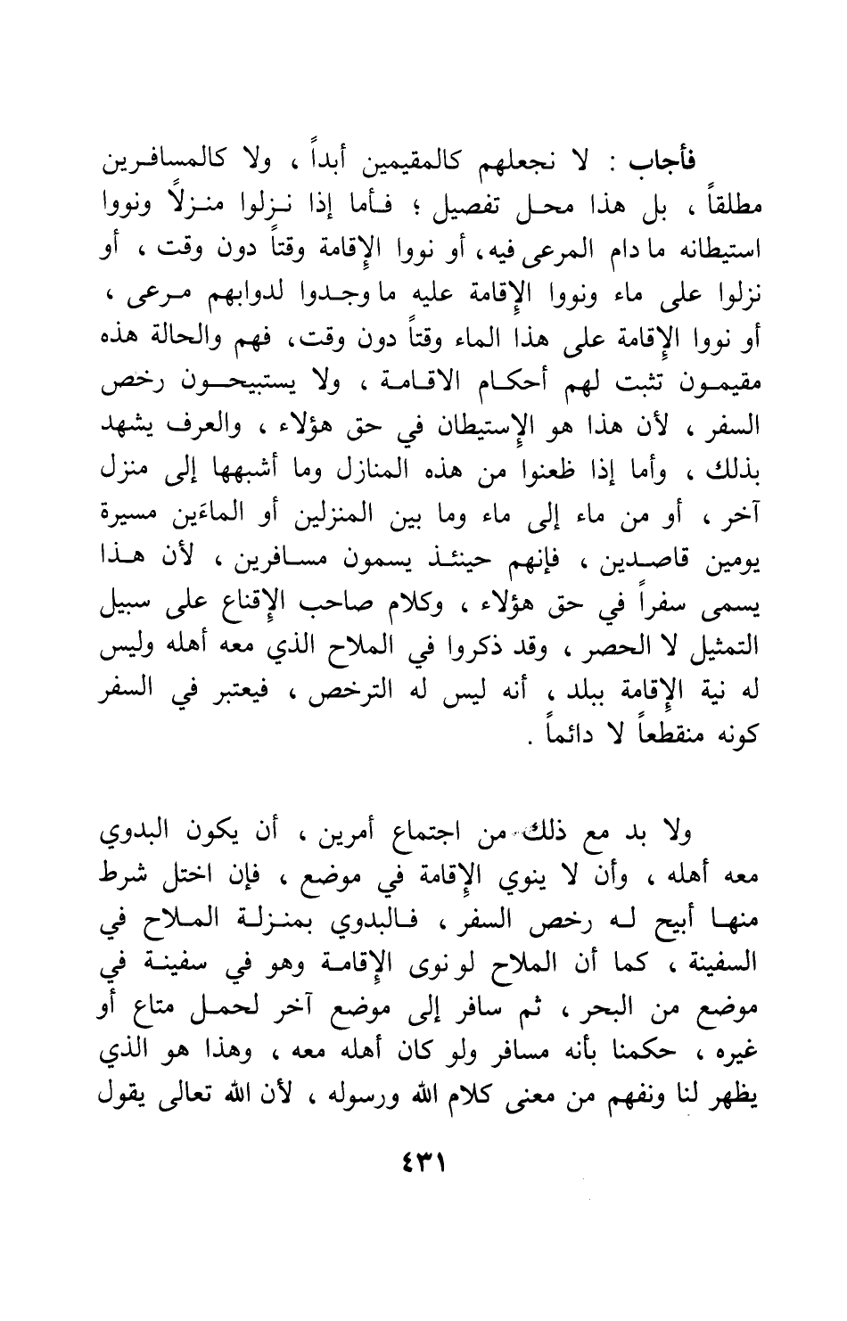 فأجاب: لا نجعلهم كالمقيمين أبداً، ولا كالمسافرين مطلقاً، بل هذا محل تفصيل: فأما إذا نزلوا منْزلاً ونووا استيطانه ما دام المرعى فيه، أو نووا الإقامة وقتًا دون وقت، أو نزلوا على ماء ونووا الإقامة عليه ما وجدوا لدوابهم مرعى، أو نووا الإقامة على هذا الماء وقتاً دون وقت، فهم والحالة هذه مقيمون تثبت لهم أحكام الإقامة، ولا يستبيحون رخص السفر، لأن هذا هو الاستيطان في حق هؤلاء، والعرف يشهد بذلك. وأما إذا ظعنوا من هذه المنازل وما أشبهها إلى منْزل آخر، أو من ماء إلى ماء، وما بين المنْزلين أو الماءين مسيرة يومين قاصدين، فإنهم حينئذ يسمون مسافرين، لأن هذا يسمى سفراً في حق هؤلاء؛ وكلام صاحب الإقناع على سبيل التمثيل لا الحصر: وقد ذكروا في الملاح الذي معه أهله وليس له نية الإقامة ببلد، أنه ليس له الترخص، فيعتبر في السفر كونه منقطعاً لا دائماً.