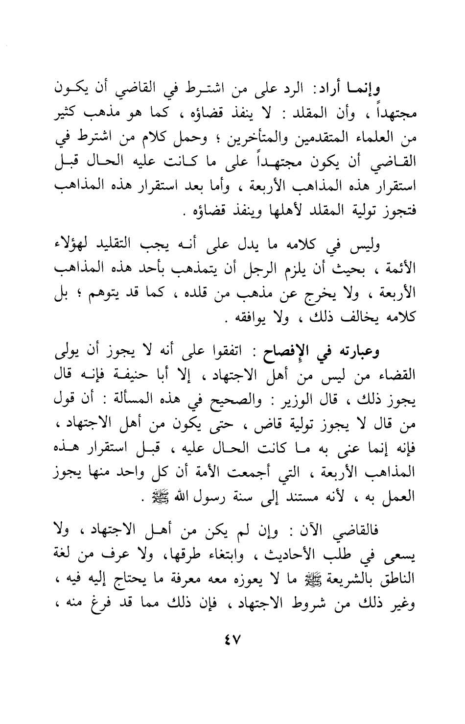 وعبارته في الإفصاح: اتفقوا على أنه لا يجوز أن يولى القضاء من ليس من أهل الاجتهاد، إلا أبا حنيفة، فإنه قال يجوز ذلك؛ قال الوزير: والصحيح في هذه المسألة: أن قول من قال: لا يجوز تولية قاض حتى يكون من أهل الاجتهاد، فإنه إنما عنى به ما كانت الحال عليه قبل استقرار هذه المذاهب الأربعة التي أجمعت الأمة أن كل واحد منها يجوز العمل به، لأنه مستند إلى سنة رسول الله صلى الله عليه وسلم.