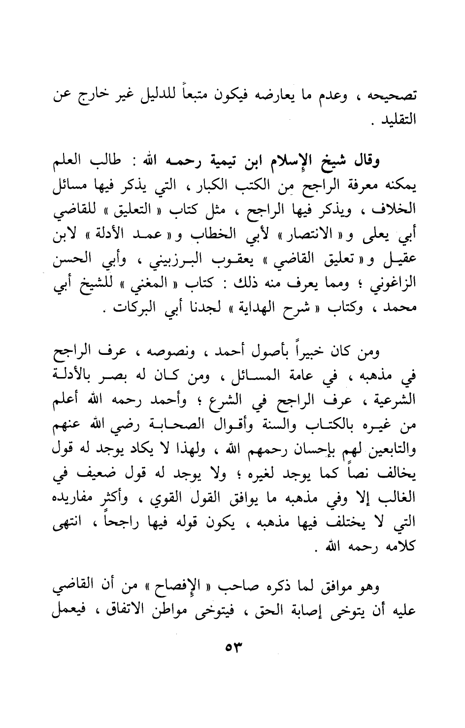 وقال شيخ الإسلام ابن تيمية، رحمه الله: طالب العلم يمكنه معرفة الراجح من الكتب الكبار التي يذكر فيها مسائل الخلاف، ويذكر فيها الراجح، مثل كتاب "التعليق" للقاضي أبي يعلى، و"الانتصار" لأبي الخطاب، و "عمد الأدلة" لابن عقيل، و"تعليق القاضي" يعقوب البرزبيني، وأبي الحسن الزاغوني; ومما يعرف منه ذلك: كتاب "المغني" للشيخ أبي محمد، وكتاب "شرح الهداية" لجدنا أبي البركات.