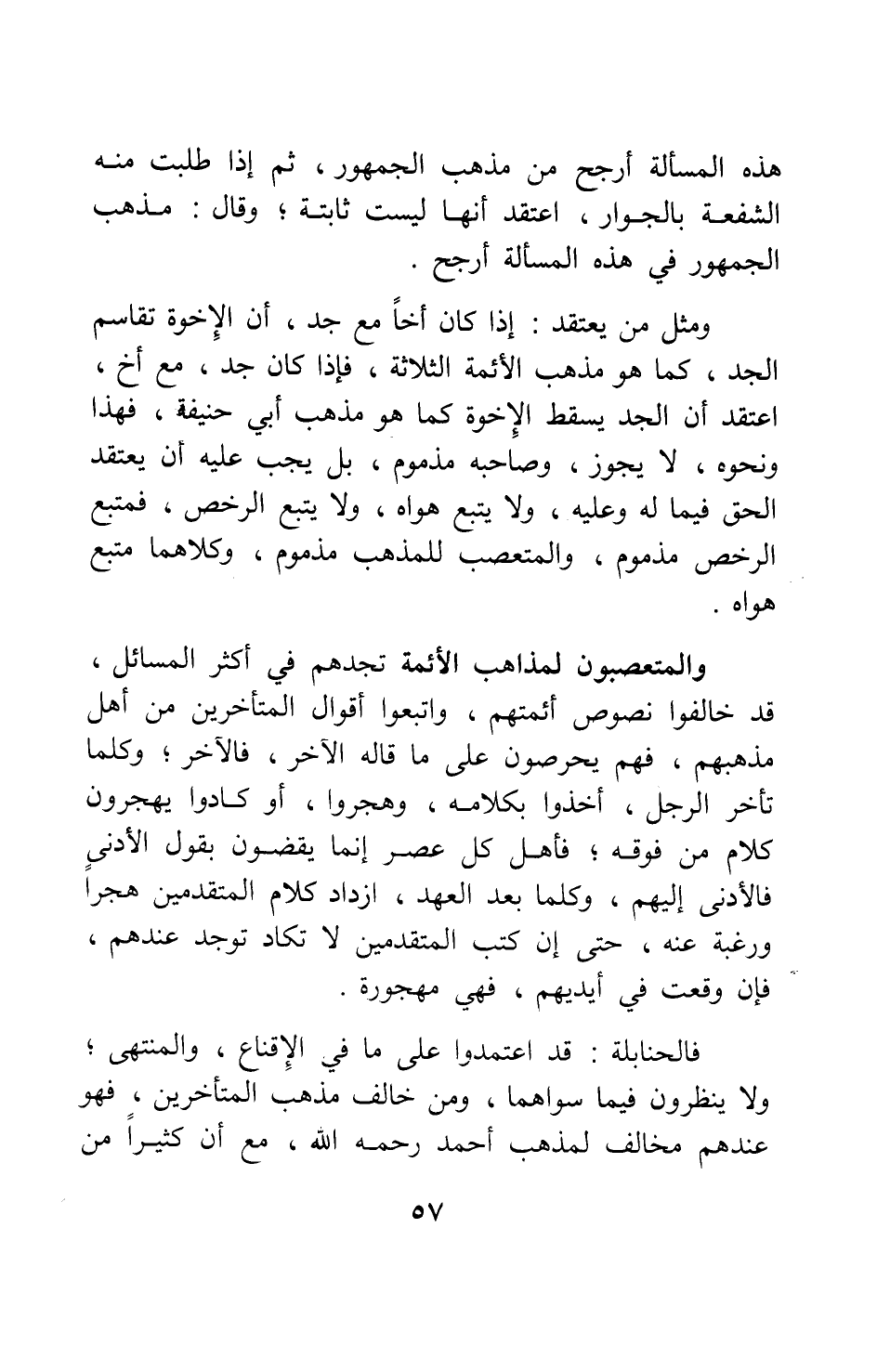 ومثل من يعتقد: إذا كان أخاً مع جد، أن الإخوة تقاسم الجد، كما هو مذهب الأئمة الثلاثة، فإذا كان جد، مع أخ، اعتقد أن الجد يسقط الإخوة كما هو مذهب أبي حنيقة؛ فهذا ونحوه لا يجوز، وصاحبه مذموم، بل يجب عليه أن يعتقد الحق فيما له وعليه، ولا يتبع هواه، ولا يتبع الرخص؛ فمتبع الرخص مذموم، والمتعصب للمذهب مذموم، وكلاهما متبع هواه.