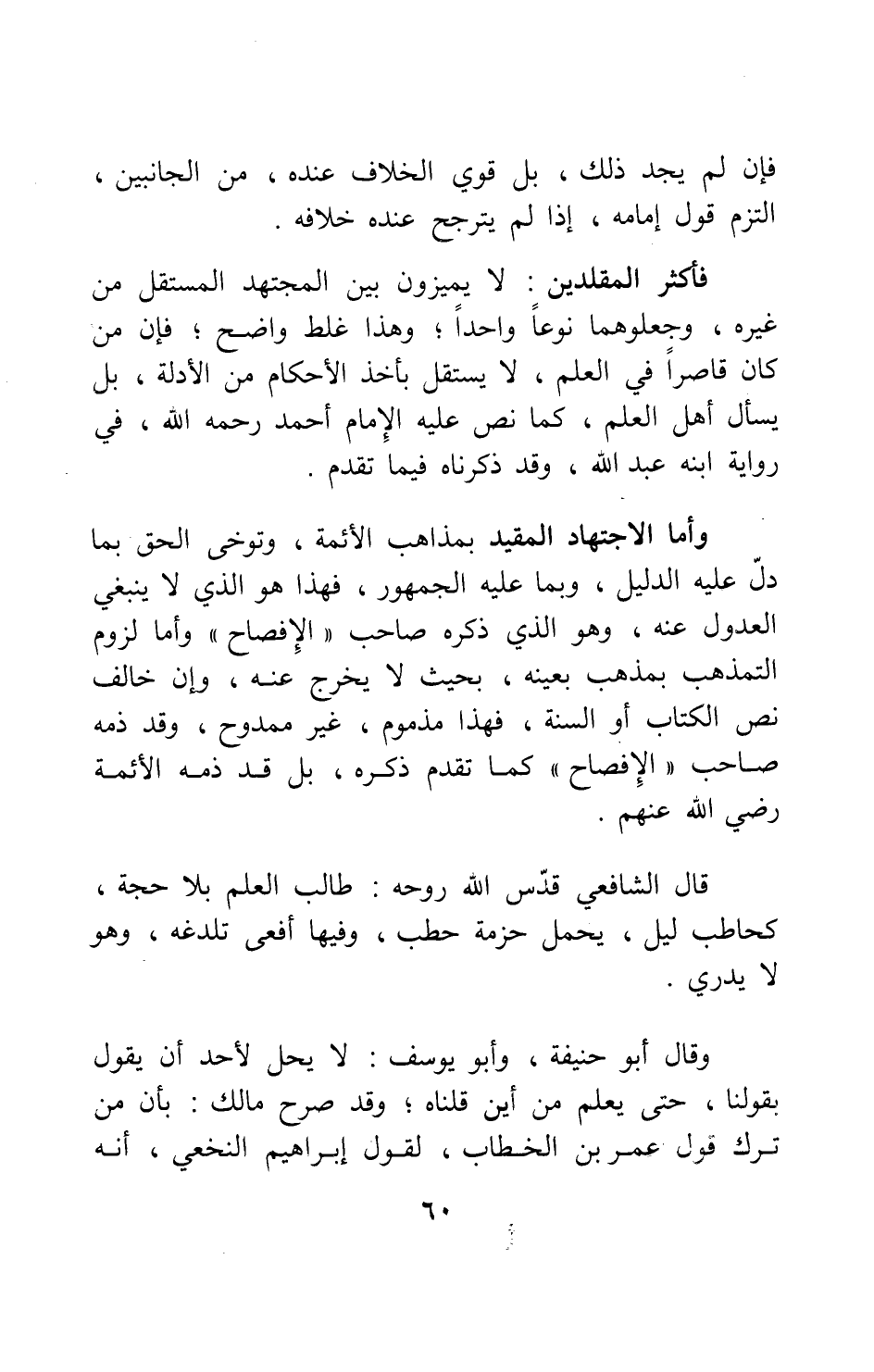 وأما الاجتهاد المقيد بمذاهب الأئمة، وتوخي الحق بما دل عليه الدليل، وبما عليه الجمهور، فهذا هو الذي لا ينبغي العدول عنه، وهو الذي ذكره صاحب الإفصاح. وأما لزوم التمذهب بمذهب بعينه بحيث لا يخرج عنه، وإن خالف نص الكتاب أو السنة، فهذا مذموم غير ممدوح؛ وقد ذمه صاحب الإفصاح كما تقدم ذكره، بل قد ذمه الأئمة، رضي الله عنهم.