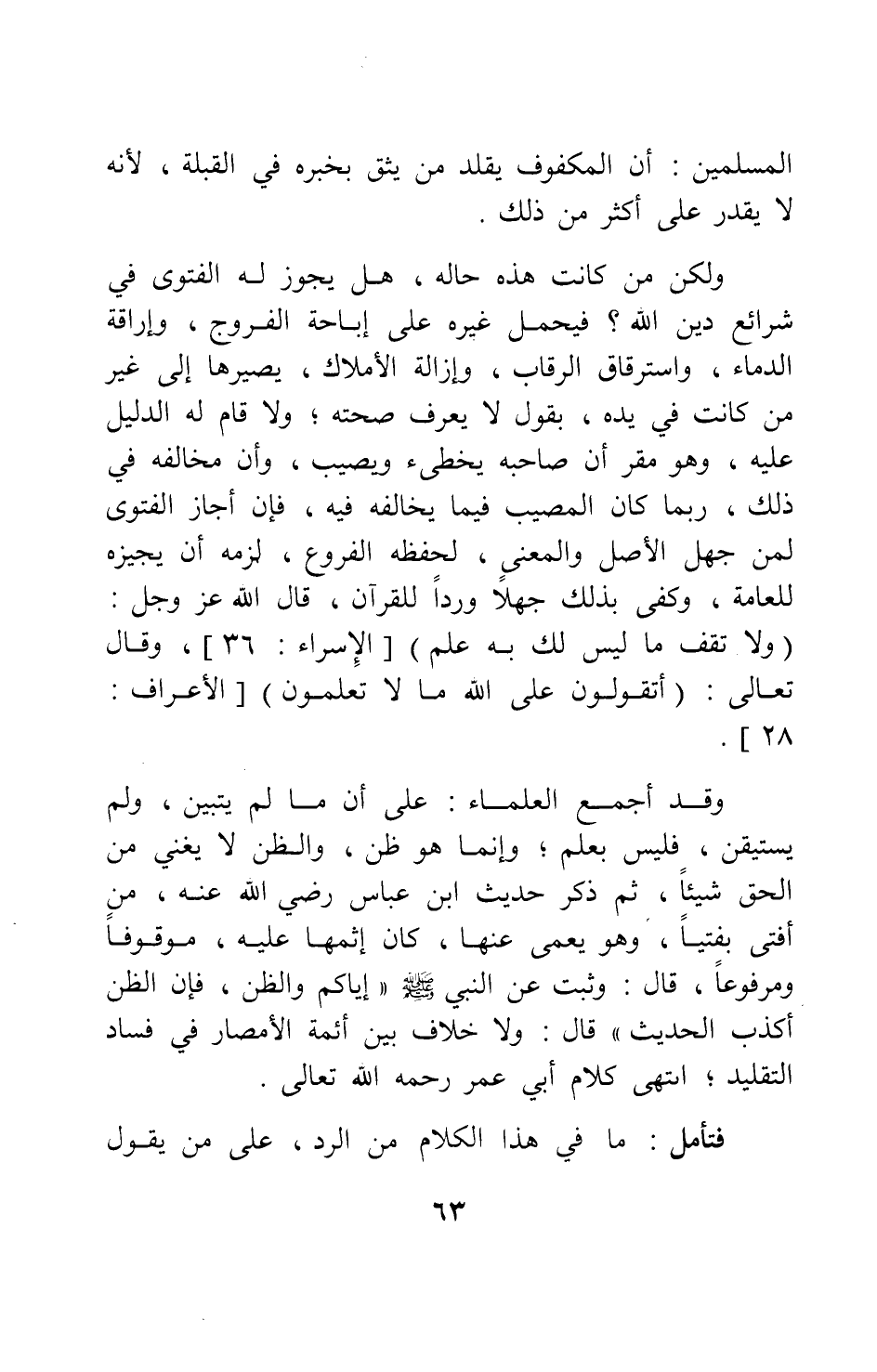 وقد أجمع العلماء: على أن ما لم يتبين ولم يستيقن، فليس بعلم; وإنما هو ظن، والظن لا يغني من الحق شيئاً؛ ثم ذكر حديث ابن عباس رضي الله عنه: "من أفتى بفتيا، وهو يعمى عنها، كان إثمها عليه "، موقوفاً ومرفوعاً، قال: وثبت عن النبي صلى الله عليه وسلم: " إياكم والظن! فإن الظن أكذب الحديث " 1، قال: ولا خلاف بين أئمة الأمصار في فساد التقليد. انتهى كلام أبي عمر، رحمه الله تعالى.
