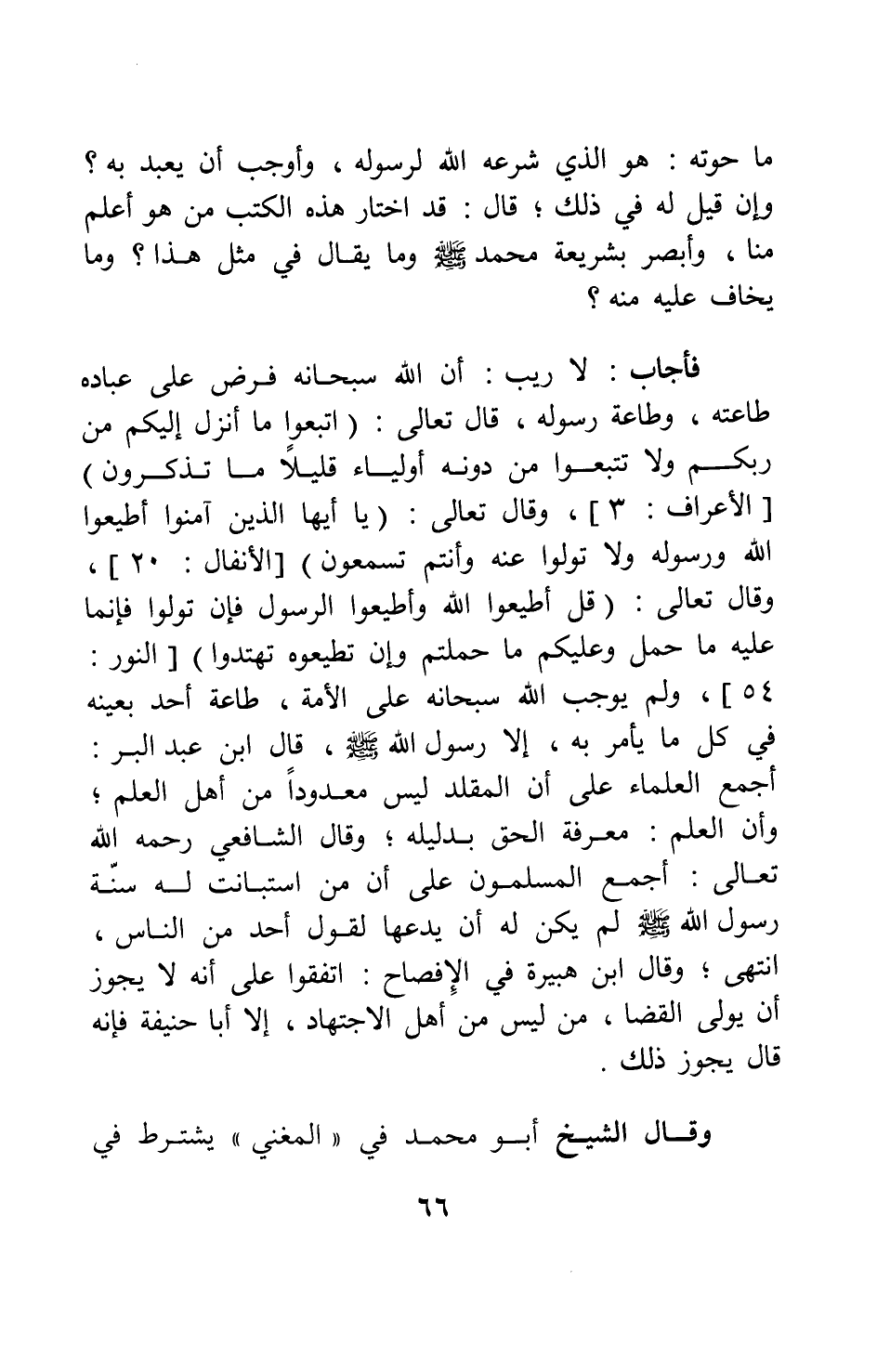فأجاب: لا ريب، أن الله سبحانه فرض على عباده طاعته، وطاعة رسوله، قال تعالى: {اتَّبِعُوا مَا أُنْزِلَ إِلَيْكُمْ مِنْ رَبِّكُمْ وَلا تَتَّبِعُوا مِنْ دُونِهِ أَوْلِيَاءَ قَلِيلاً مَا تَذَكَّرُونَ} [سورة الأعراف آية: 3] ، وقال تعالى: {يَا أَيُّهَا الَّذِينَ آمَنُوا أَطِيعُوا اللَّهَ وَرَسُولَهُ وَلا تَوَلَّوْا عَنْهُ وَأَنْتُمْ تَسْمَعُونَ} [سورة الأنفال آية: 20] ، وقال تعالى: {قُلْ أَطِيعُوا اللَّهَ وَأَطِيعُوا الرَّسُولَ فَإِنْ تَوَلَّوْا فَإِنَّمَا عَلَيْهِ مَا حُمِّلَ وَعَلَيْكُمْ مَا حُمِّلْتُمْ وَإِنْ تُطِيعُوهُ تَهْتَدُوا} [سورة النور آية: 54] ، ولم يوجب الله سبحانه على الأمة طاعة أحد بعينه في كل ما يأمر به، إلا رسول الله صلى الله عليه وسلم؛ قال ابن عبد البر: أجمع العلماء على أن المقلد ليس معدوداً من أهل العلم، وأن العلم معرفة الحق بدليله; وقال الشافعي، رحمه الله تعالى: أجمع المسلمون على أن من استبانت له سنة رسول الله صلى الله عليه وسلم لم يكن له أن يدعها لقول أحد من الناس. انتهى. وقال ابن هبيرة في الإفصاح: اتفقوا على أنه لا يجوز أن يولى القضا من ليس من أهل الاجتهاد، إلا أبا حنيفة فإنه قال: يجوز ذلك.