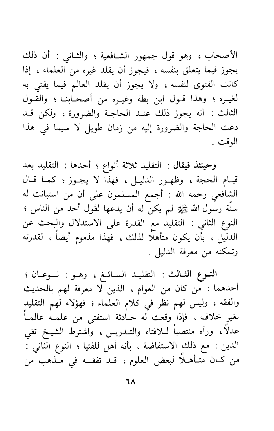 النوع الثالث: التقليد السائغ، وهو نوعان: أحدهما: من كان من العوام الذين لا معرفة لهم بالحديث والفقه، وليس لهم نظر في كلام العلماء، فهؤلاء لهم التقليد بغير خلاف؛ فإذا وقعت له حادثة استفتى من علمه عالماً عدلاً، ورآه منتصباً للإفتاء والتدريس؛ واشترط الشيخ تقي الدين مع ذلك الاستفاضة بأنه أهل للفتيا. النوع الثاني: من كان متأهلًا لبعض العلوم، قد تفقه في مذهب من
