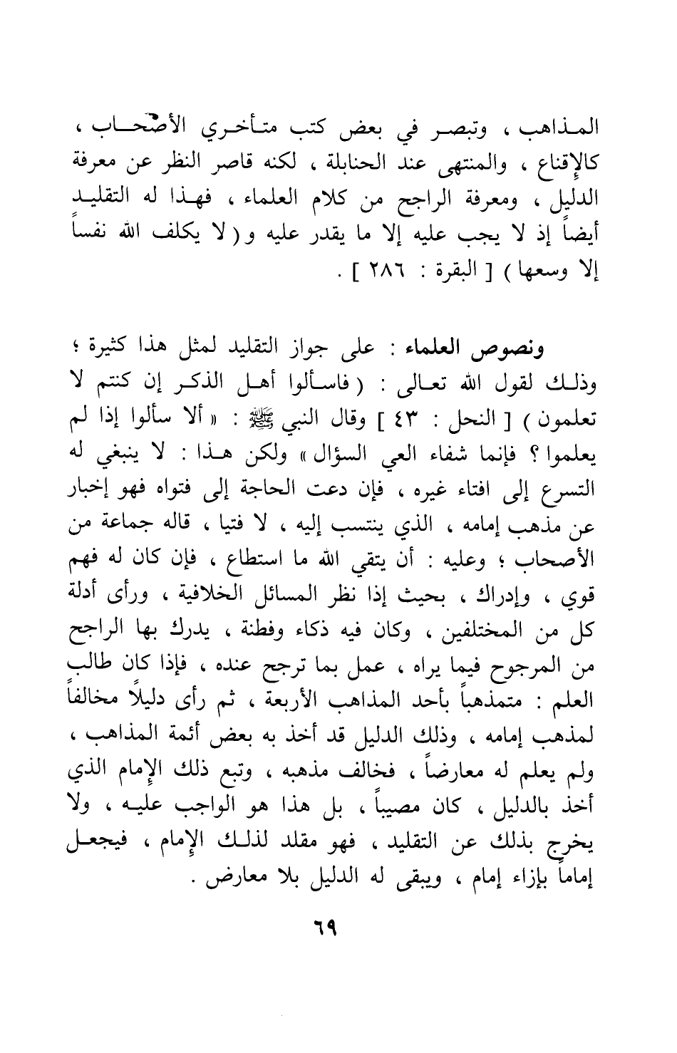 المذاهب، وتبصر في بعض كتب متأخري الأصحاب، كالإقناع، والمنتهى عند الحنابلة، لكنه قاصر النظر عن معرفة الدليل، ومعرفة الراجح من كلام العلماء، فهذا له التقليد أيضاً؛ إذ لا يجب عليه إلا ما يقدر عليه و {لا يُكَلِّفُ اللَّهُ نَفْساً إِلاَّ وُسْعَهَا} [سورة البقرة آية: 286] .