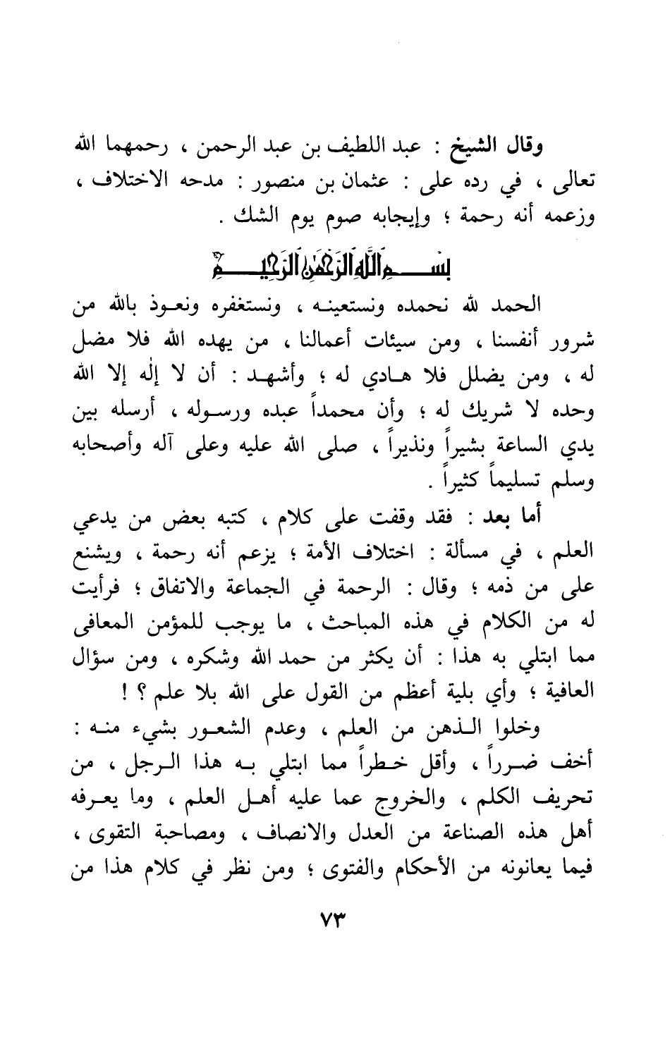 وقال الشيخ عبد اللطيف بن عبد الرحمن، رحمهما الله تعالى، في رده على عثمان بن منصور مدحه الاختلاف، وزعمه أنه رحمة، وإيجابه صوم يوم الشك: