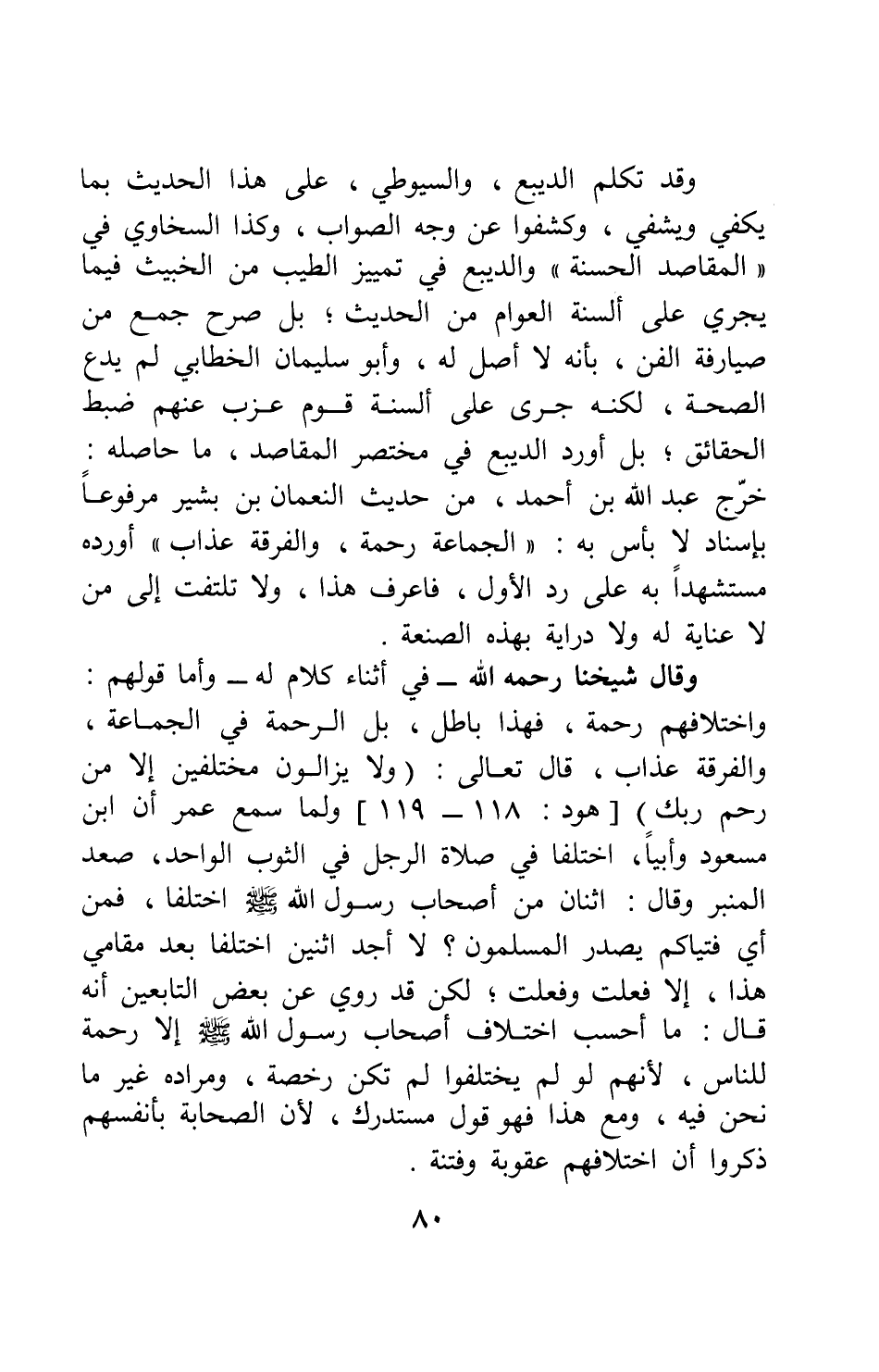 وقد تكلم الديبع والسيوطي، على هذا الحديث بما يكفي ويشفي، وكشفوا عن وجه الصواب، وكذا السخاوي في المقاصد الحسنة والديبع في تمييز الطيب من الخبيث فيما يجري على ألسنة العوام من الحديث; بل صرح جمع من صيارفة الفن، بأنه لا أصل له؛ وأبو سليمان الخطابي لم يدع الصحة، لكنه جرى على ألسنة قوم عزب عنهم ضبط الحقائق، بل أورد الديبع في مختصر المقاصد، ما حاصله: خرج عبد الله بن أحمد، من حديث النعمان بن بشير مرفوعاً، بإسناد لا بأس به: "الجماعة رحمة، والفرقة عذاب " 1، أورده مستشهداً به على رد الأول؛ فاعرف هذا، ولا تلتفت إلى من لا عناية له ولا دراية بهذه الصنعة.