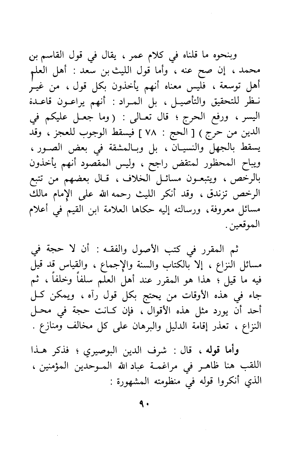 وبنحوه ما قلناه في كلام عمر، يقال في قول القاسم بن محمد، إن صح عنه؛ وأما قول الليث بن سعد: أهل العلم أهل توسعة، فليس معناه أنهم يأخذون بكل قول، من غير نظر للتحقيق والتأصيل، بل المراد: أنهم يراعون قاعدة اليسر، ورفع الحرج، قال تعالى: {وَمَا جَعَلَ عَلَيْكُمْ فِي الدِّينِ مِنْ حَرَجٍ} [سورة الحج آية: 78] ، فيسقط الوجوب للعجز؛ وقد يسقط بالجهل والنسيان، بل وبالمشقة في بعض الصور، ويباح المحظور لمقتضٍ راجح. وليس المقصود أنهم يأخذون بالرخص، ويتبعون مسائل الخلاف؛ قال بعضهم: من تتبع الرخص تزندق. وقد أنكر الليث، رحمه الله، على الإمام مالك مسائل معروفة، ورسالته إليه حكاها العلامة ابن القيم في إعلام الموقعين.