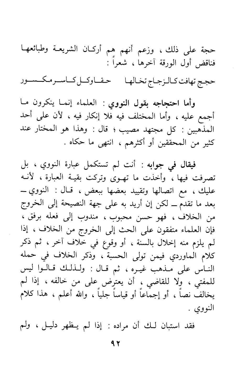 فيقال في جوابه: أنت لم تستكمل عبارة النووي، بل تصرفت فيها، وأخذت ما تهوى وتركت بقية العبارة، لأنه عليك، مع اتصالها وتقييد بعضها ببعض؛ قال النووي - بعد ما تقدم -: لكن إن أريد به على جهة النصيحة إلى الخروج من الخلاف، فهو حسن محبوب، مندوب إلى فعله برفق؛ فإن العلماء متفقون على الحث إلى الخروج من الخلاف، إذا لم يلزم منه إخلال بالسنة، أو وقوع في خلاف آخر، ثم ذكر كلام الماوردي فيمن تولى الحسبة، وذكر الخلاف في حمله الناس على مذهب غيره، ثم قال: ولذلك قالوا: ليس للمفتي ولا للقاضي، أن يعترض على من خالفه، إذا لم يخالف نصاً، أو إجماعاً أو قياساً جلياً، والله أعلم؛ هذا كلام النووي.