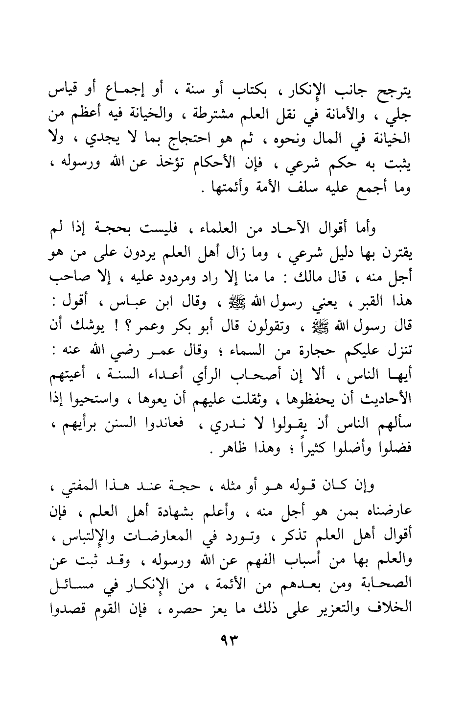وأما أقوال الآحاد من العلماء، فليست بحجة إذا لم يقترن بها دليل شرعي، وما زال أهل العلم يردون على من هو أجل منه؛ قال مالك: ما منا إلا راد ومردود عليه، إلا صاحب هذا القبر، يعني رسول الله صلى الله عليه وسلم. وقال ابن عباس: "أقول: قال رسول الله صلى الله عليه وسلم، وتقولون: قال أبو بكر وعمر؟! يوشك أن تنْزل عليكم حجارة من السماء، ". وقال عمر رضي الله عنه: "أيها الناس، ألا إن أصحاب الرأي أعداء السنة، أعيتهم الأحاديث أن يحفظوها، وثقلت عليهم أن يعوها، واستحيوا إذا سألهم الناس أن يقولوا: لا ندري، فعاندوا السنن برأيهم، فضلوا وأضلوا كثيراً "؛ وهذا ظاهر.
