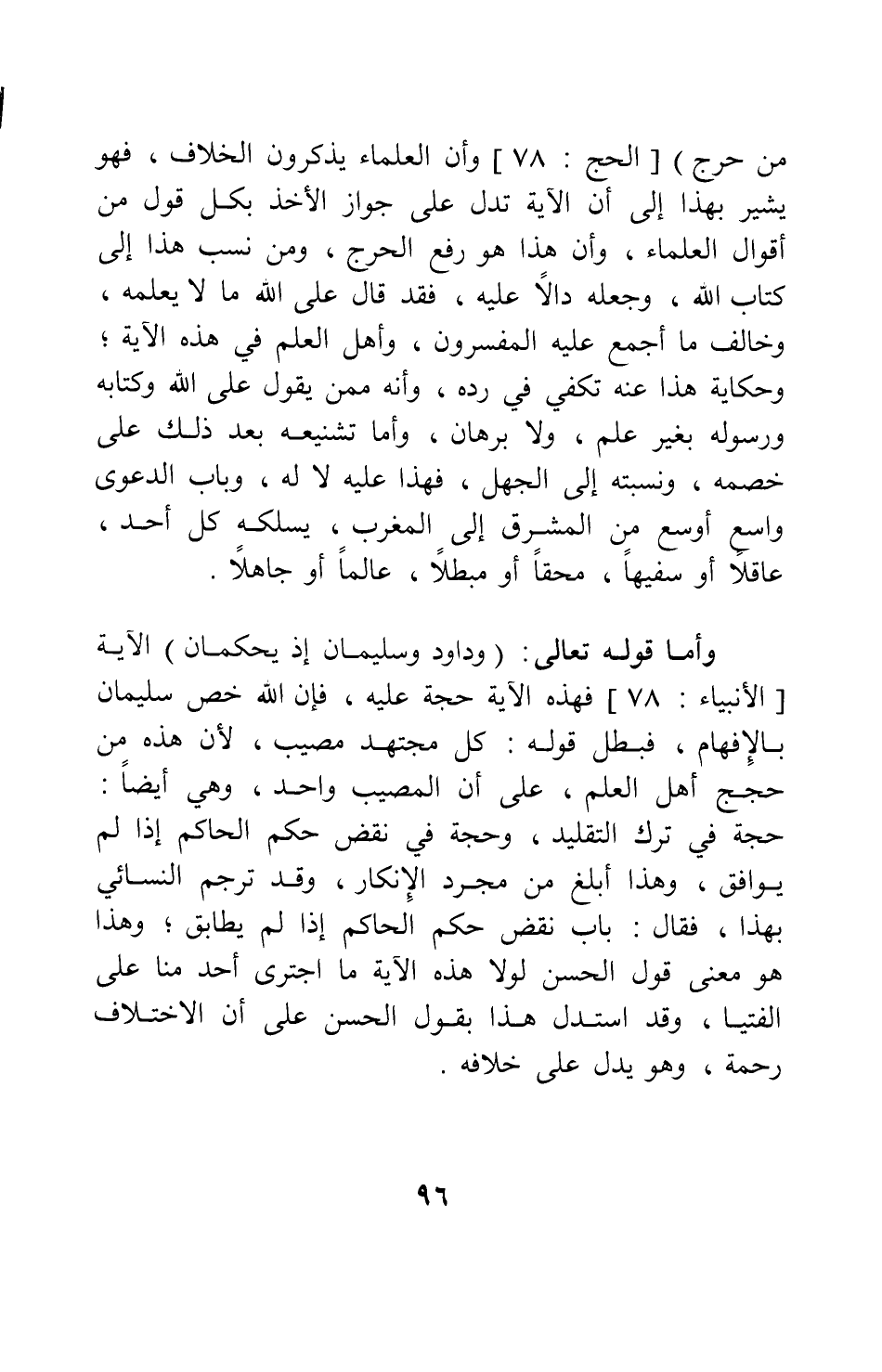 وأما قوله تعالى: {وَدَاوُدَ وَسُلَيْمَانَ إِذْ يَحْكُمَانِ} الآية [سورة الأنبياء آية: 78] ، فهذه الآية حجة عليه؛ فإن الله خص سليمان بالإفهام، فبطل قوله: كل مجتهد مصيب، لأن هذه من حجج أهل العلم على أن المصيب واحد، وهي أيضاً حجة في ترك التقليد، وحجة في نقض حكم الحاكم إذا لم يوافق، وهذا أبلغ من مجرد الإنكار؛ وقد ترجم النسائي بهذا، فقال: باب نقض حكم الحاكم إذا لم يطابق; وهذا هو معنى قول الحسن: لولا هذه الآية ما اجترأ أحد منا على الفتيا؛ وقد استدل هذا بقول الحسن على أن الاختلاف رحمة، وهو يدل على خلافه.