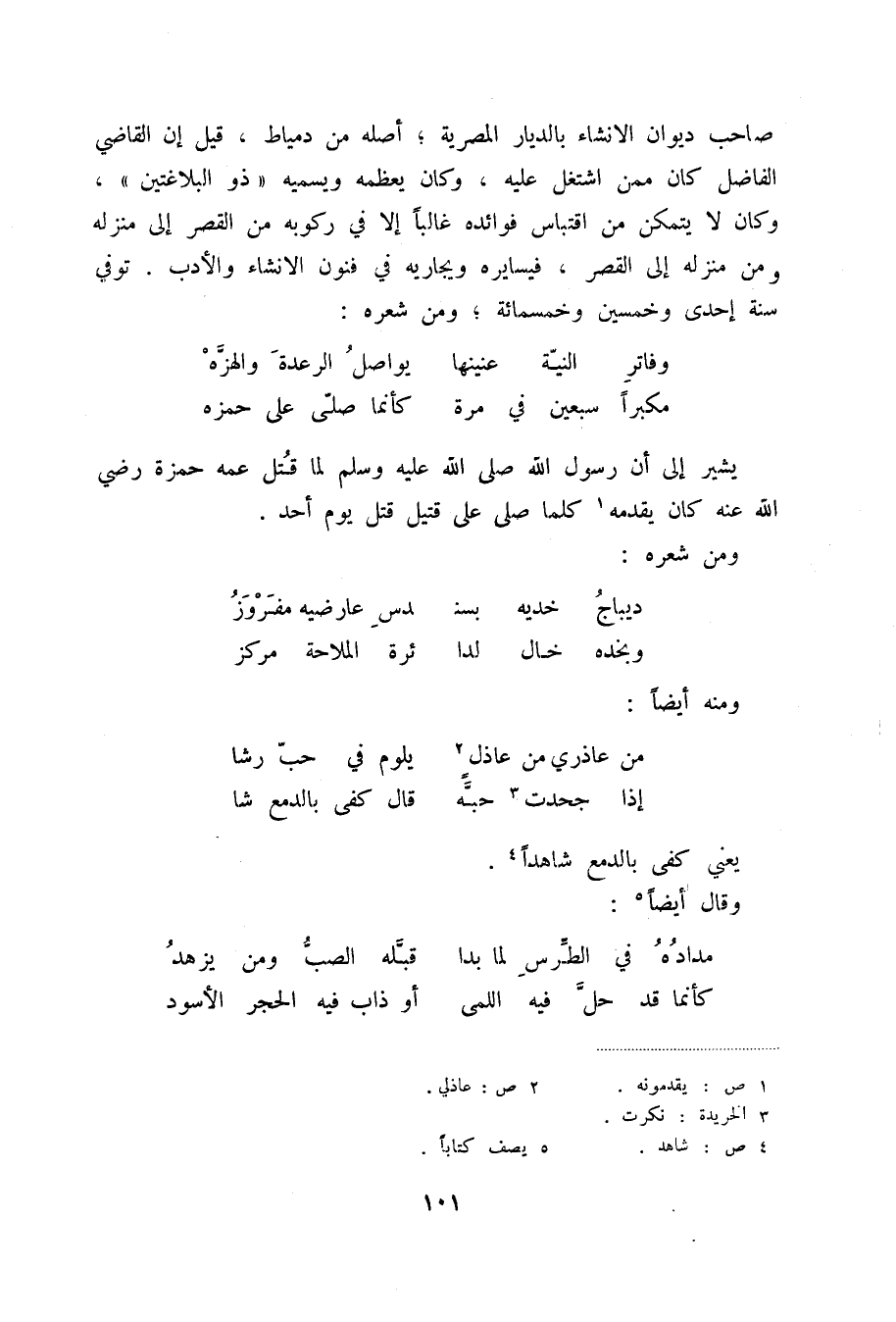 صاحب ديوان الإنشاء بالديار المصرية؛ أصله من دمياط، قيل إن القاضي الفاضل كان ممن اشتغل عليه، وكان يعظمه ويشميه " ذو البلاغتين "، وكان لا يتمكن من اقتباس فوائده غلاباً إلا في ركوبه من القصر إلى منزله ومن منزله إلى القصر، فيسايره ويجاريه في فنون الإنشاء والأدب. توفي سنة إحدى وخمسين وخمسمائة؛ ومن شعره: