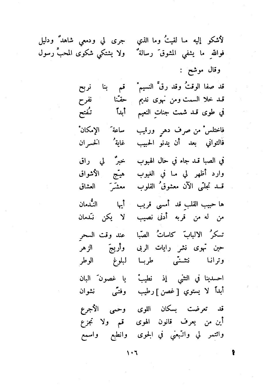 فو الله ما يشفي المشوق راسلة ... ولا يشتكي شكوى المحب رسول وقال موشح: