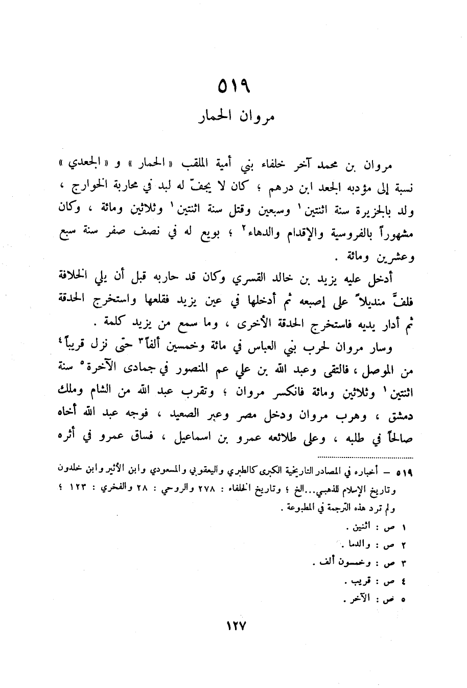 مروان بن محمد آخر خلفاء بني أمية الملقب " الحمار " و " الجعدي " نسبة إلى مؤدبه الجعد ابن درهم؛ كان لا يجف له لبد في محاربة الخوارج، ولد بالجزيرة سنة اثنتين (2) وسبعين وقتل سنة اثنتين وثلاثين ومائة، وكان مشهوراً بالفروسية والإقدام والدهاء (3) ؛ بويع له في نصف صفر سنة سبع وعشرين ومائة.