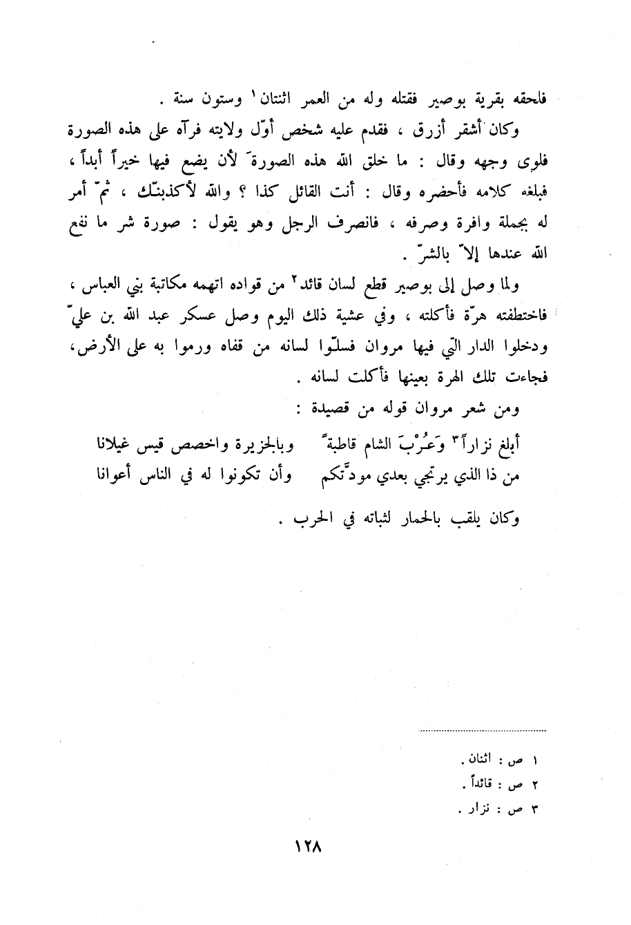 ولما وصل إلى بوصير قطع لسان قائد (2) من قواده اتهمه مكاتبة بني العباس، فاختطفته هرة فأكلته، وفي عشية ذلك اليوم وصل عسكر عبد الله بن علي ودخلوا الدار التي فيها مروان فسلوا لسانه من قفاه ورموا به على الأرض، فجائت تلك الهرة بعينها فأكلت لسانه.