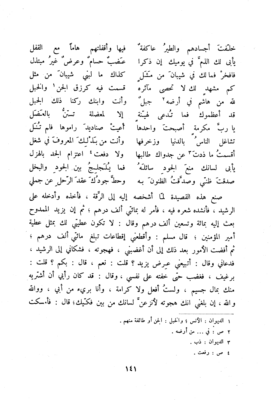 صدقت ظني وصدقت الظنون به ... وحط جودك عقد الرحل عن جملي صنع هذه القصيدة لما أشخصه إليه إلى الرقة، فأخذه وأدخله على الرشيد، فأنشده شعره فيه، فأمر له بمائتي ألف درهم؛ ثم إن يزيد الممدوح بعث إليه بمائة وتسعين ألف درهم وقال: لا تكون عطيتي لك بمثل عطية أمير المؤمنين؛ قال مسلم: وأقطعني إقطاعات تبلغ ألف درهم؛ ثم أفضت الأمور بعد ذلك إلى أن أغضبتني، فهجوته، فشكاني إلى الرشيد، فدعاني وقال: أتبيعني عرض يزيد؟ قلت: نعم، قال: بكم؟ قلت: برغيف، فغضب حتى خفته على نفسي، وقال: قد كان رأيي أن أشتريه منك بمال جسيم، ولست أفعل ولا كرامة، وأنا بريء من أبي، ووالله والله، إن بلغني أنك هجوته لأنزعن لسانك من بين فكيك؛ قال: فأمسكت