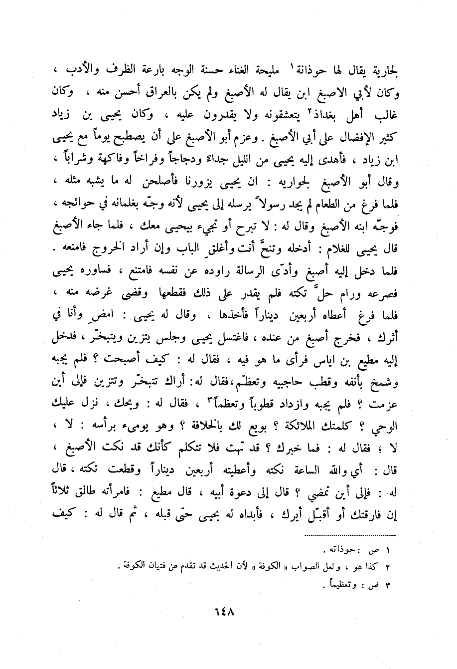 لجارية يقال له حوذانة (1) مليحة الغناء حسنة الوجه بارعة الظرف والأدب، وكان لأبي الأصبغ ابن يقال له الأصبغ ولم يكن بالعراق أحسن منه، وكان غالب أهل بغداد (2) يتعشقونه ولا يقدرون عليه، وكان يحيى بن زياد كثير الإفضال على أبي الأصبغ. وعزم أبو الأصبغ على أن يصطبح يوماً مع يحيى ابن زياد، فاهدي إليه يحيى من الليل جداء ودجاجاً وفراخاً وفاكهة وشراباً، وقال أبو الأصبغ لجورايه: إن يحيى يزورنا فأصلحن له ما يشبه مثله، فلما فرغ من الطعام لم يجد رسولاً يرسله إلى يحيى لأنه وجه بغلمانه في حوائجه، فوجه ابنه الأصبغ وقال له: لا تبرح أو تجيء بيحيى معك، فلماجاء الأصبغ قال يحيى للغلام: أدخله وتنح أنت وأغلق الباب وإن أراد الخروج فامنعه. فلما دخل إليه أصبغ وأدى الرسالة راوده عن نفسه فامتنع، فاروه يحيى فصرعه ورام حل تكته فل يقدر على ذلك فقطعها وقضى غرضه منه، فلما فرغ أعطاه أربعين ديناراً فأخذها، وقال له يحيى: امض وأنا في أثرك، فخرج أصبغ من عنده، فاغتسل يحيى وجلس يتزين ويتبخر، فدخل إليه مطيع بن إياس فرأى ما هو فيه، فقال له: كيف أصبحت؟ فلم يجبه وشمخ بأنفه وقطب حاجبيه وتعظم، فقال له: أراك تتبخر وتتزين فإلى أين عزمت؟ فلم يجبه وازداد قطوباً وتعظماً (3) ، فقال له: ويحك، نزل عليك الوحي؟ كلمتك الملائكة؟ بويع لك بالخلافة؟ وهو يوميء برأسه: لا، لا؛ فقال له: فما خبرك؟ قد تهت فلا تتكلم كأنك قد نكت الأصبغ، قال: أي والله الساعة نكته وأعطيته أربعين ديناراً قطعت تكته، قال له: فإلى أين تمضي؟ قال إلى دعوة أبيه، قال مطيع: فامرأته طالق ثلاثاً إن فارقتك أو أقبل أيرك، فأبداه له يحيى حتى قبله، ثم قال له: كيف