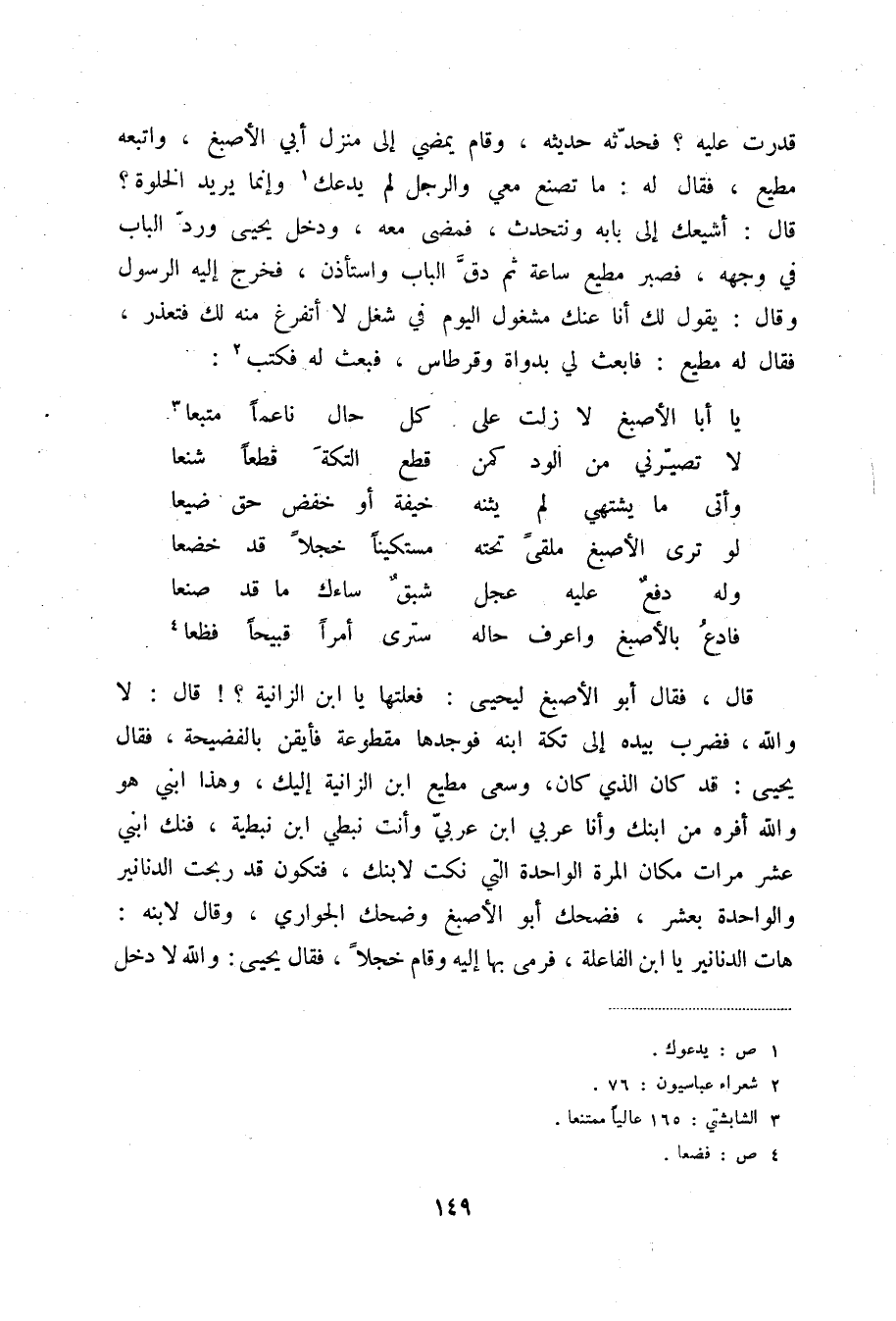 فادع بالأصبغ واعرف حاله ... سترى أمراً قبيحاً فظعا (4) قال، فقال أبو الأصبغ ليحيى: فعلتها يا ابن الزانية؟! قال: لا والله، فضرب بيده إلى تكة ابنه فوجدها مقطوعة فأيقن بالفضيحة، فقال يحيى: قد كان الذي كان، وسعى مطيع ابن الزانية إليك، وهذا ابني هو والله أفره من ابنك وأما عربي ابن عربي وأنت نبطي ابن نبطية، فنك ابني عشر مرات مكان المرة الواحدة التي نكت لابنك، فتكون قد ربحت الدنانير والوحدة بعشر، فضحك أبو الأصبغ وضحك الجواري، وقال لابنه: هات الدنانير يا ابن الفاعلة، فرمى بها إليه وقام خجلاً، فقال يحيى: والله لا دخل
