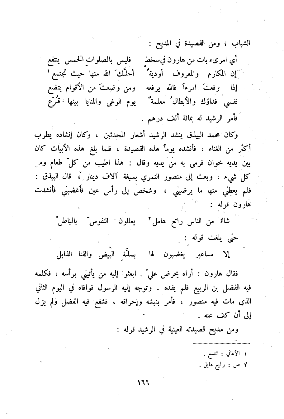 إلا مساعير يغضبون لها ... بسلة البيض والقنا الذابل فقال هارون: أراه يحرض علي. ابعثوا إليه من يأتيني برأسه، فكلمه فيه الفضل بن الربيع فلم يفده. وتوجه إليه الرسول فوافاه في اليوم الثاني الذي مات فيه منصور، فأمر ينبشه وإحراقه، فشفع فيه الفضل ولم يزل إلى أن كف عنه.