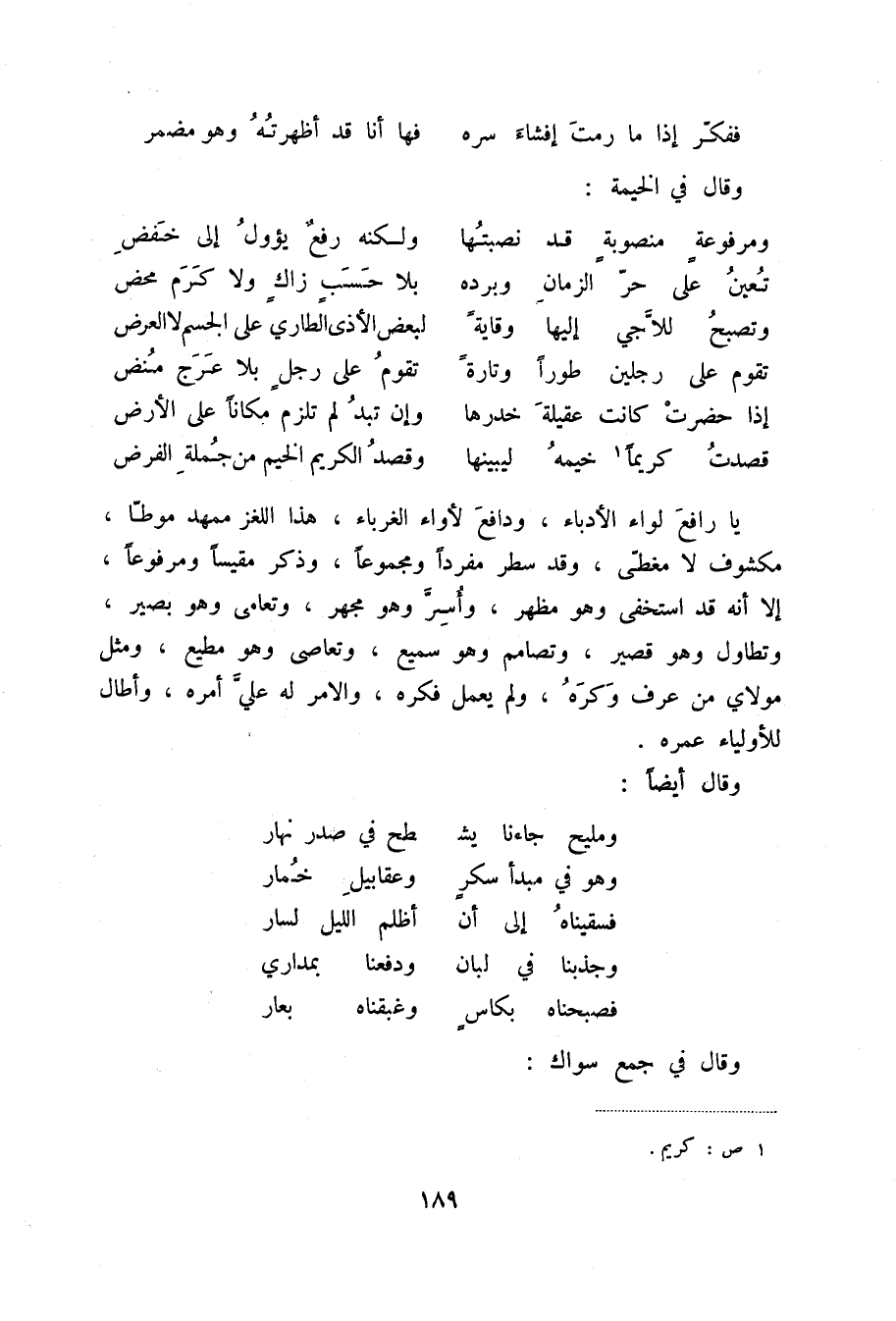 قصدت كريما (1) خيمه ليبينها ... وقصد الكريم الخيم من جملة الفرض يا رافع لواء الأدباء، ودافع لأواء الغرباء، هذا اللغز ممهد موطا، مكشوف لا مغطى، وقد سطر مفردا ومجموعاً، وذكر مقيسا ومرفوعا، إلا أنه قد استخفى وهو مظهر، وأسر وهو مجهر، وتعامى وهو بصير، وتطاول وهو قصير، وتصامم وهو سميع، وتعاصى وهو مطيع، ومثل مولاي من عرف وكره، ولم يعمل فكره، والأمر له علي أمره، وأطال للأولياء عمره.