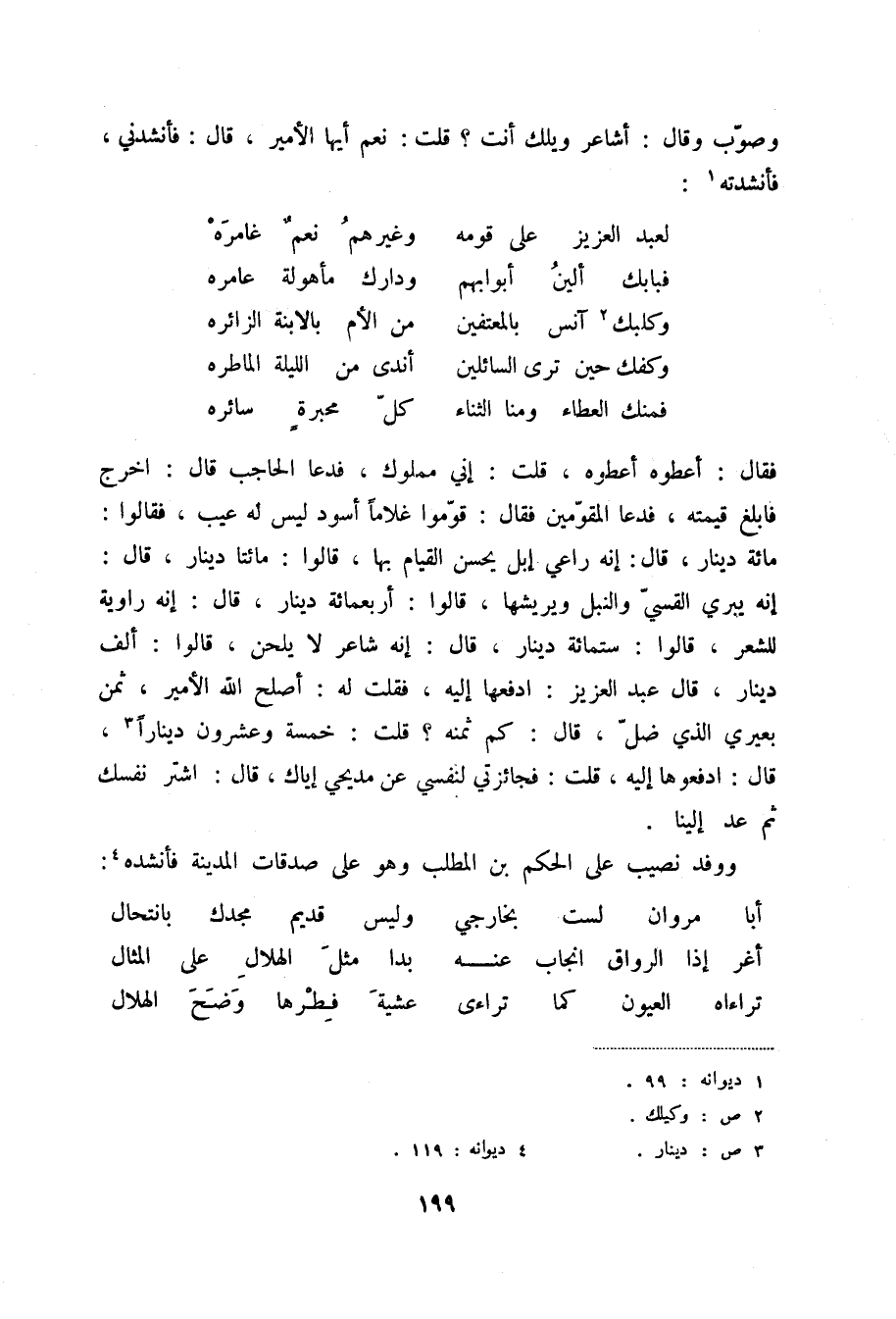 فمنك العطاء ومنا الثناء ... كلّ محبرة سائره فقال: أعطوه أعطوه، قلت: إني مملوك، فدعا الحاجب قال: اخرج فابلغ قيمته، فدعا المقوّمين فقال: قوّموا غلاماً أسود ليس له عيب، فقالوا: مائة دينار، قال: إنه راعي إبل يحسن القيام بها، قالوا: مائتا دينار، قال أنه يبري القسي والنبل ويريشها قالوا: أربعمائة دينار قال: إنه راوية للشعر، قالوا: ستمائة دينار، قال: إنه شارع لا يلحن، قالوا: الف دينار، قال عبد العزيز: ادفعها إليه، فقلت له: أصلح الله الأمير، ثمن بعيري الذي ضلّ، قال: كم ثمنه؟ قلت: خمسة وعشرون ديناراً (3) ، قال: ادفعوها إليه: قلت: فجائزتي لنفسي عن مديحي إياك، قال: اشتر نفسك ثم عد إلينا.