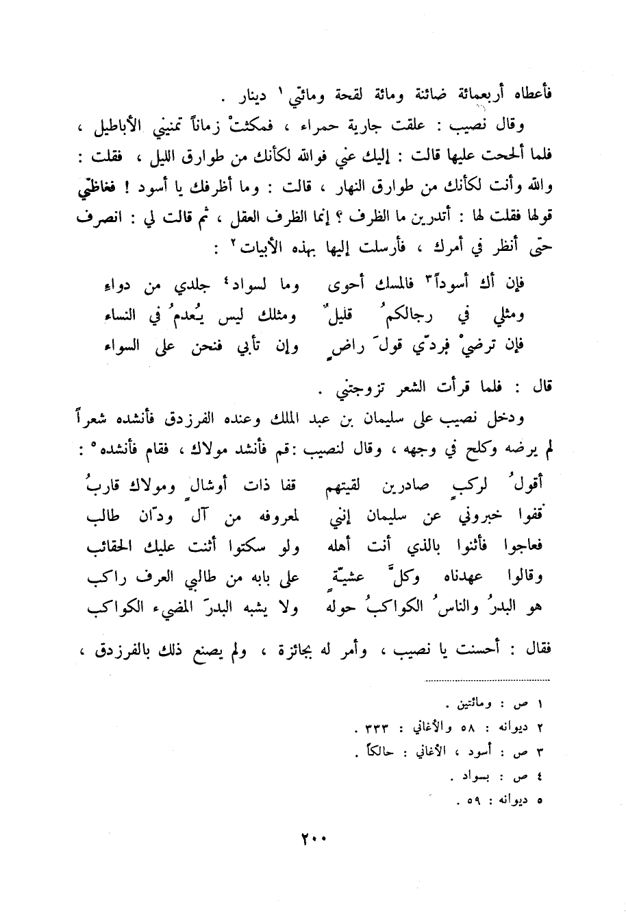 هو البدر والنسا الكواكب حوله ... ولا يشبه البدر المضيء الكواكب فقال: أحسنت يا نصيب، وأمر له بجائزة، ولم يصنع ذلك بالفرزدق،